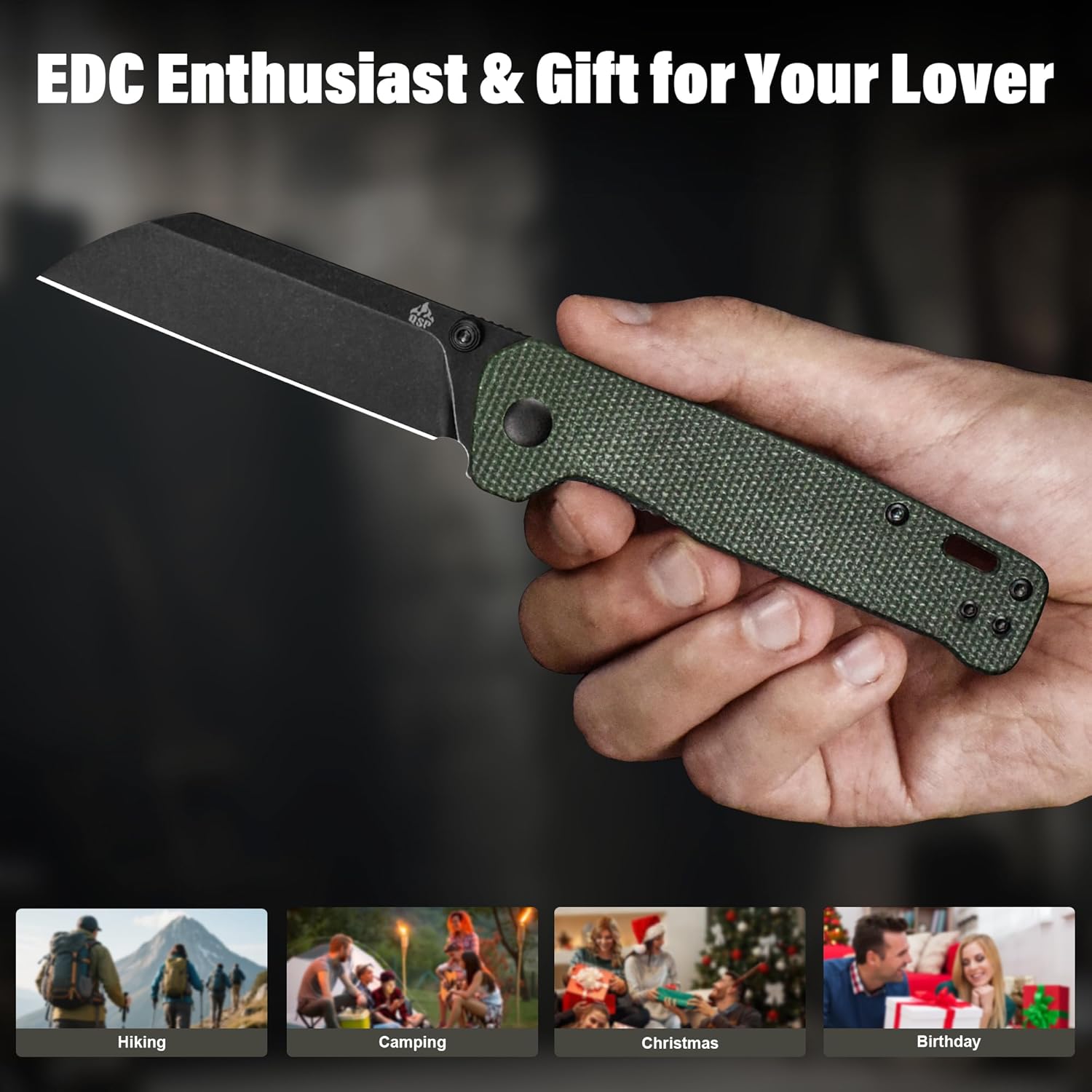 QSP Penguin V2 Folding Pocket Knife, 3.06" D2 Black Stonewash Blade EDC Knife, Green Micarta Handle, Liner Lock, Ceramic Ball Bearings, Reversible SS Deep Carry Clip