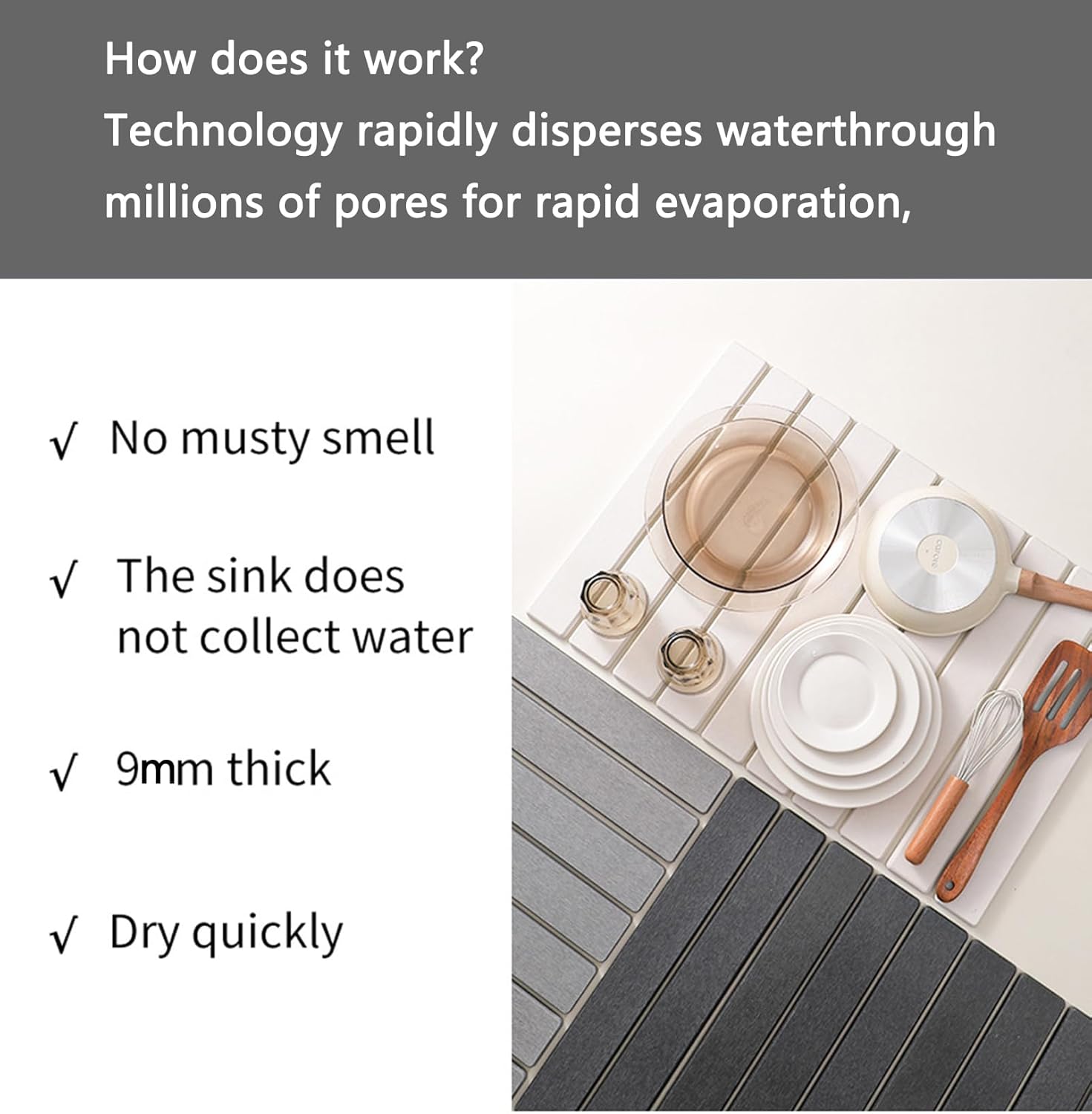 - 【Quick-drying and super absorbent】The kitchen countertop dish drying mat has super absorbent capacity. It is a natural quick-drying diatomaceous earth material that can absorb water instantly and dry quickly, keeping the countertop always dry and clean, while allowing your dishes to air dry naturally, away from moisture or odor.