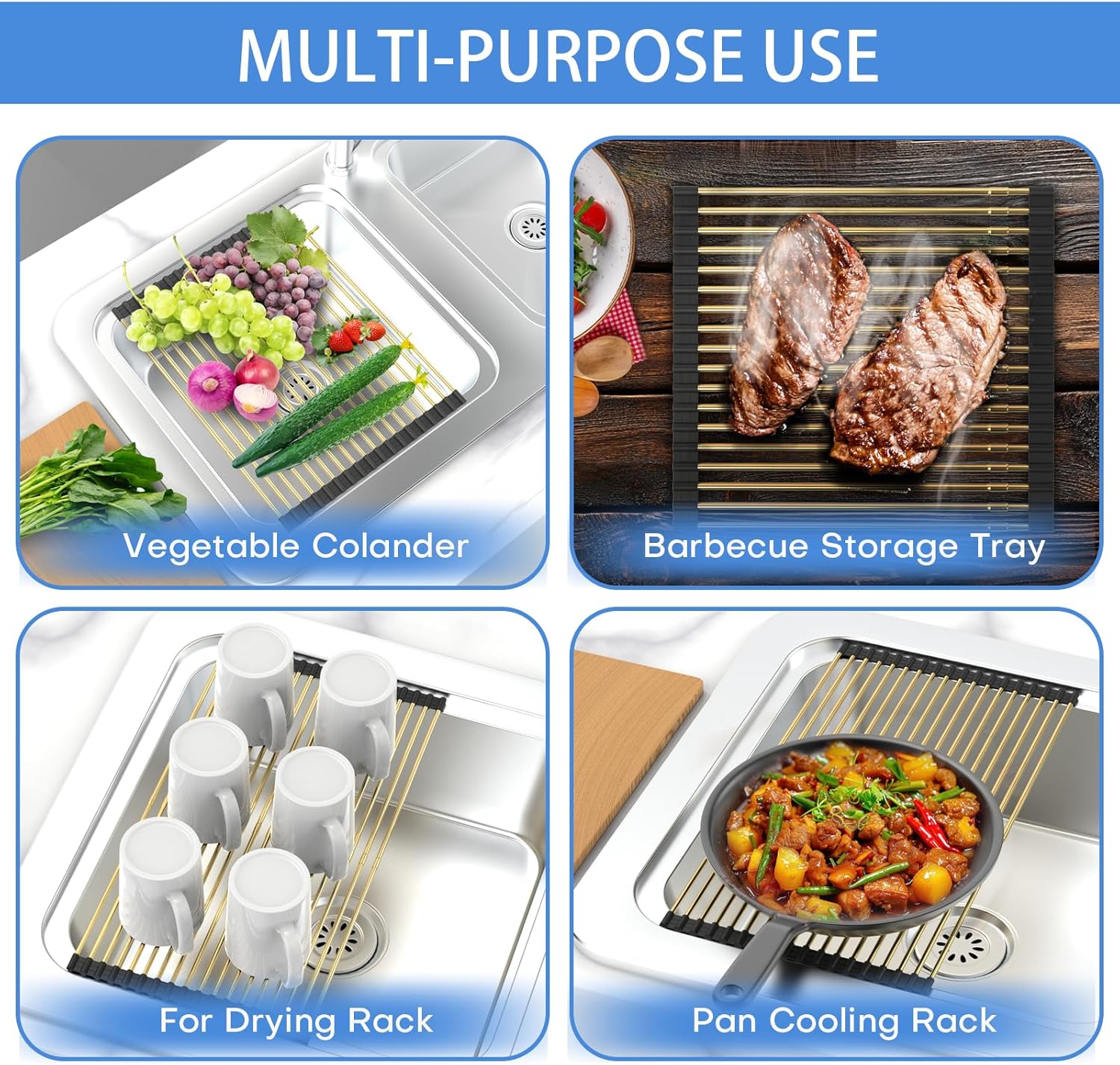 - Multi-purpose roll up sink drying rack: Washed fruits, vegetables, bowls, plates, cups, pans can be dried in this drying rack. It can also cool your baked goods. It can also be disassembled and stuck in the faucet for use