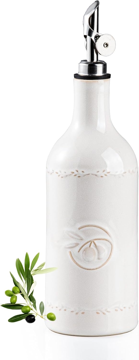 Olive Oil Dispenser Bottle, 18 oz Ceramic Oil Dispenser for Kitchen, Large Capacity Oli Bottle and Vinegar Cruet with Stainless Steel Spout, Cooking Oil Dispenser, Pack of 1, Off-White