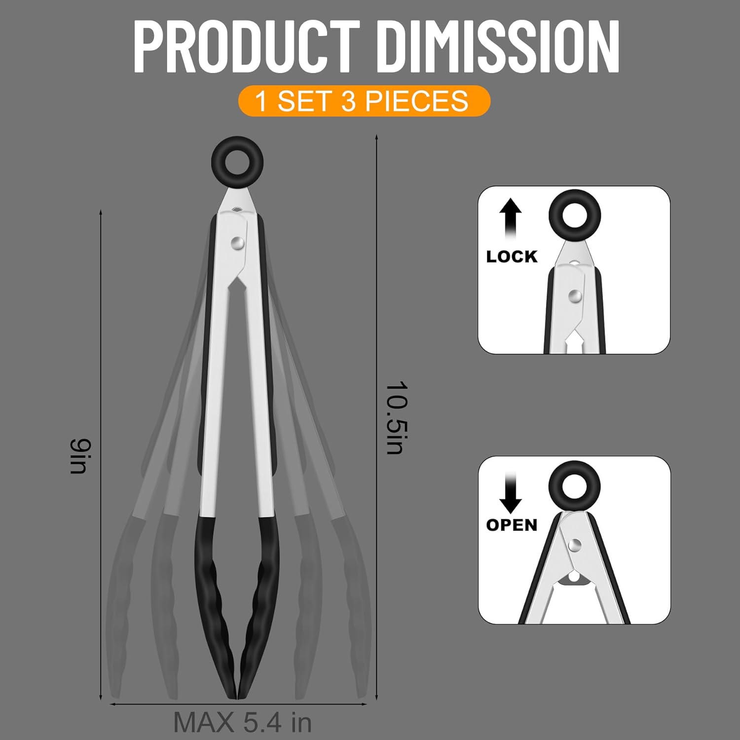 - TOP QUALITY: Hotec silicone tongs are constructed with 1MM Thickened high quality 304 stainless steel and Food Grade slicone, sturdy, heat resistance, anti-rust, anti-corrosion, light weight, easy to handle, like new forever. Package includes: 3 x 9-inch serving tongs (Black)