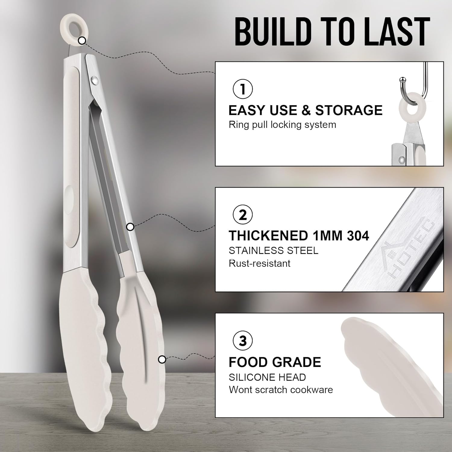 - TOP QUALITY: Hotec silicone tongs are constructed with 1MM Thickened high quality 304 stainless steel and Food Grade slicone, sturdy, heat resistance, anti-rust, anti-corrosion, light weight, easy to handle, like new forever. Package includes: 3 x 9-inch serving tongs (Black Grey Khaki)