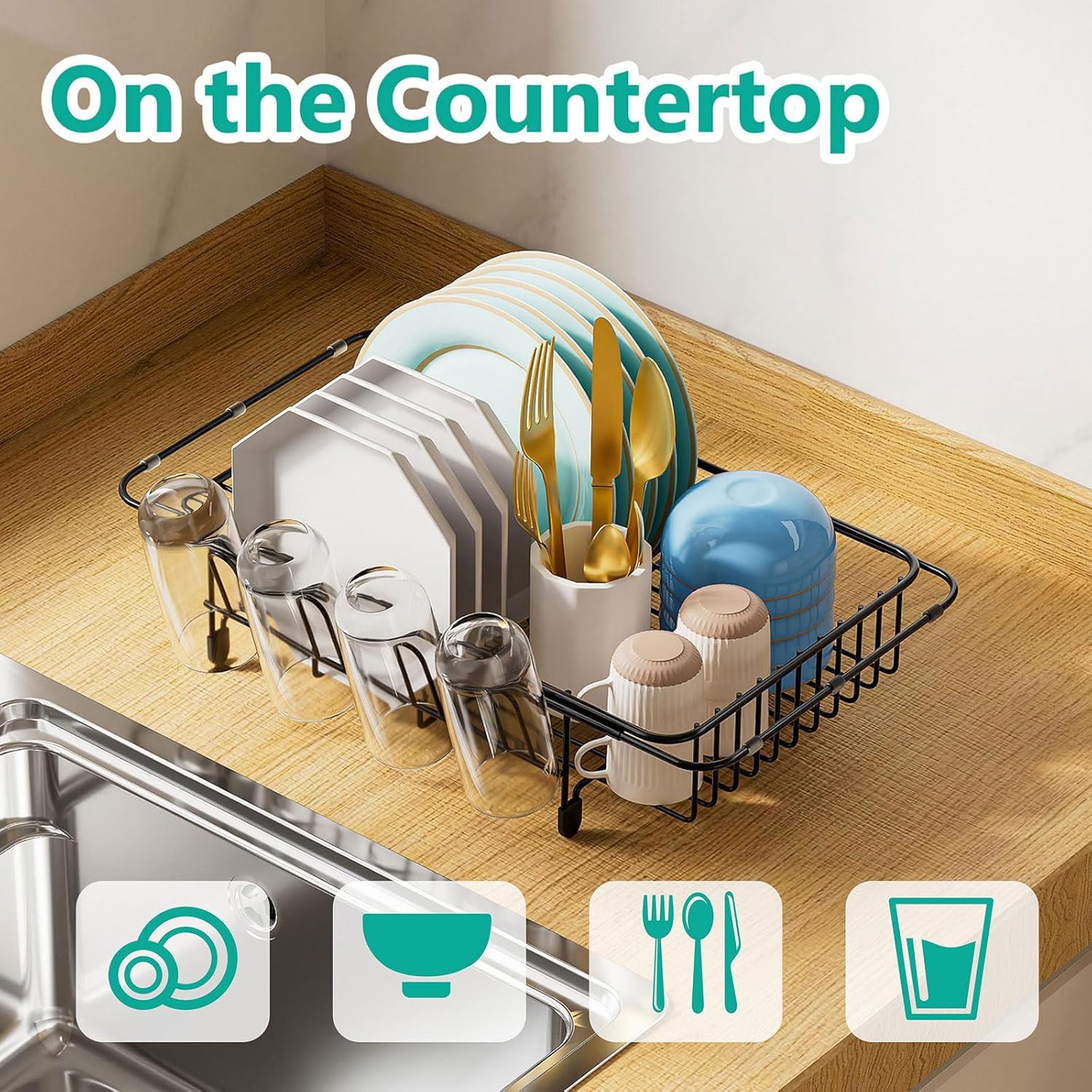 Dish Drying Rack in Sink Expandable Stainless Steel Kitchen Dish Drainer with 4 Cup Holders, Black