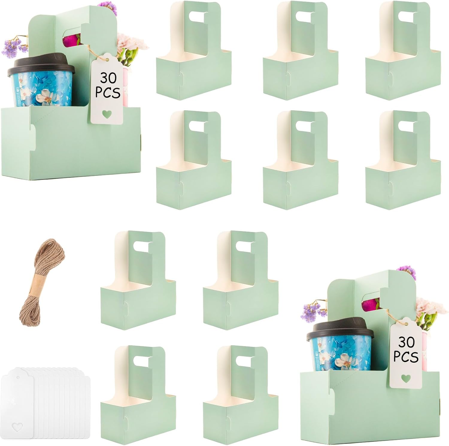 - Sufficient quantity: Our coffee holder package contains a total of 30 green cardboard two-cup drink holders, and also comes with love cards and rope. You can write their message or wishes on the card and place them on the paper cup holder with the rope. It is suitable for Teacher Appreciation Week and Mother's Day, Valentine's Day and other festivals