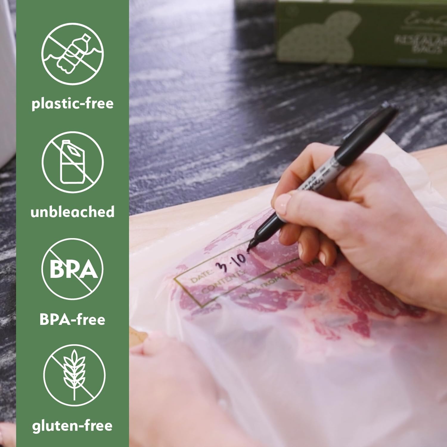 - OCCASIONS: ENA's unbleached and dye-free resealable bags are made from plant starch in off-white color. They are packaged in recyclable boxes for easier storage and usage. ENA's food bags keep food fresh and nutritious. They are perfect for meat, fish, and chicken storages and marinade in the refrigerator. They are perfect for storing food like sandwiches, bite-size snacks, fruits, cookies, pie and quick bites.