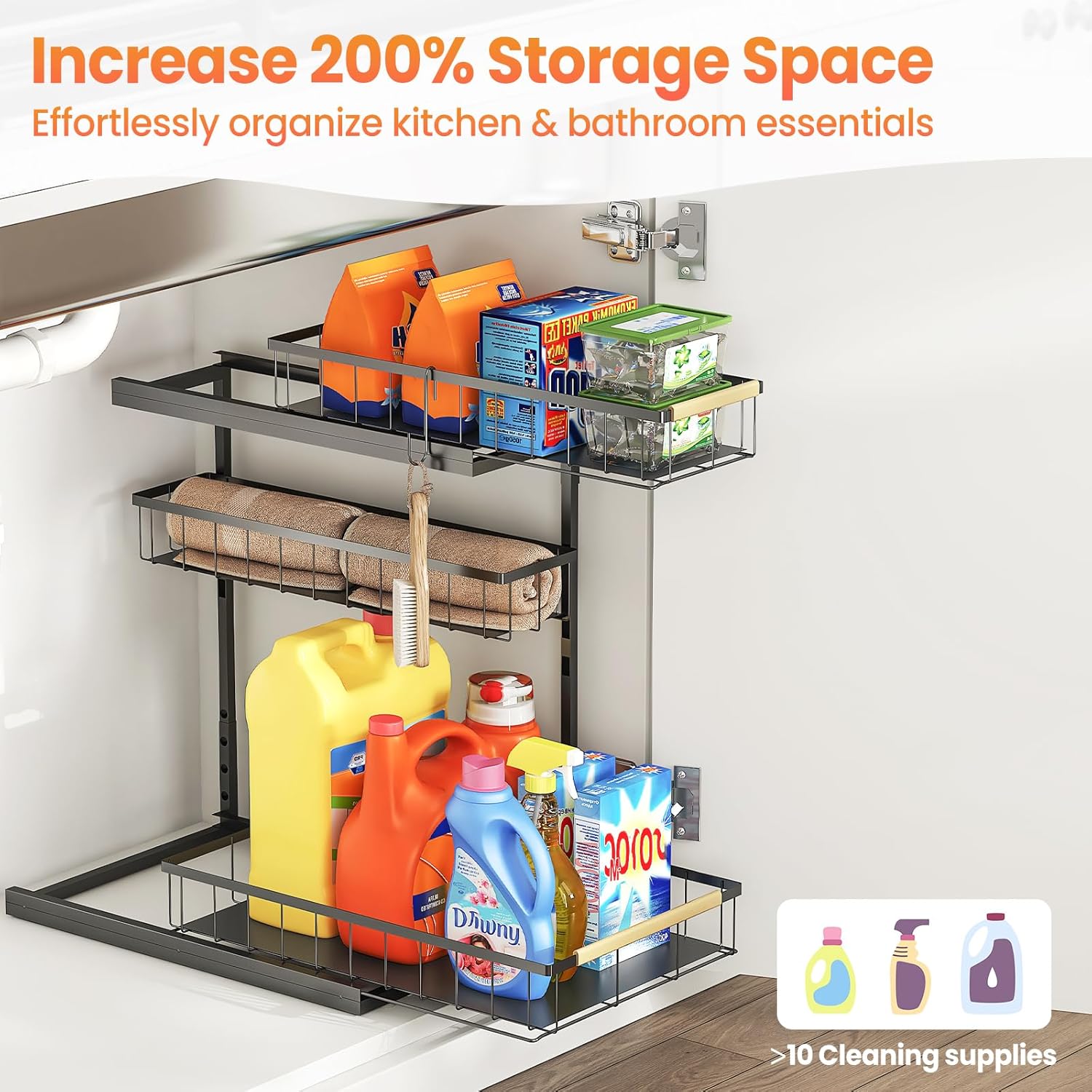 Under Sink Organizer and Storage for Bathroom and Kitchen - 2 Pack Pull Out Under Cabinet Shelf Organizers - 2 3 Tier Sliding Out Drawer Organization for Home Cabinets Shelves and Drawers