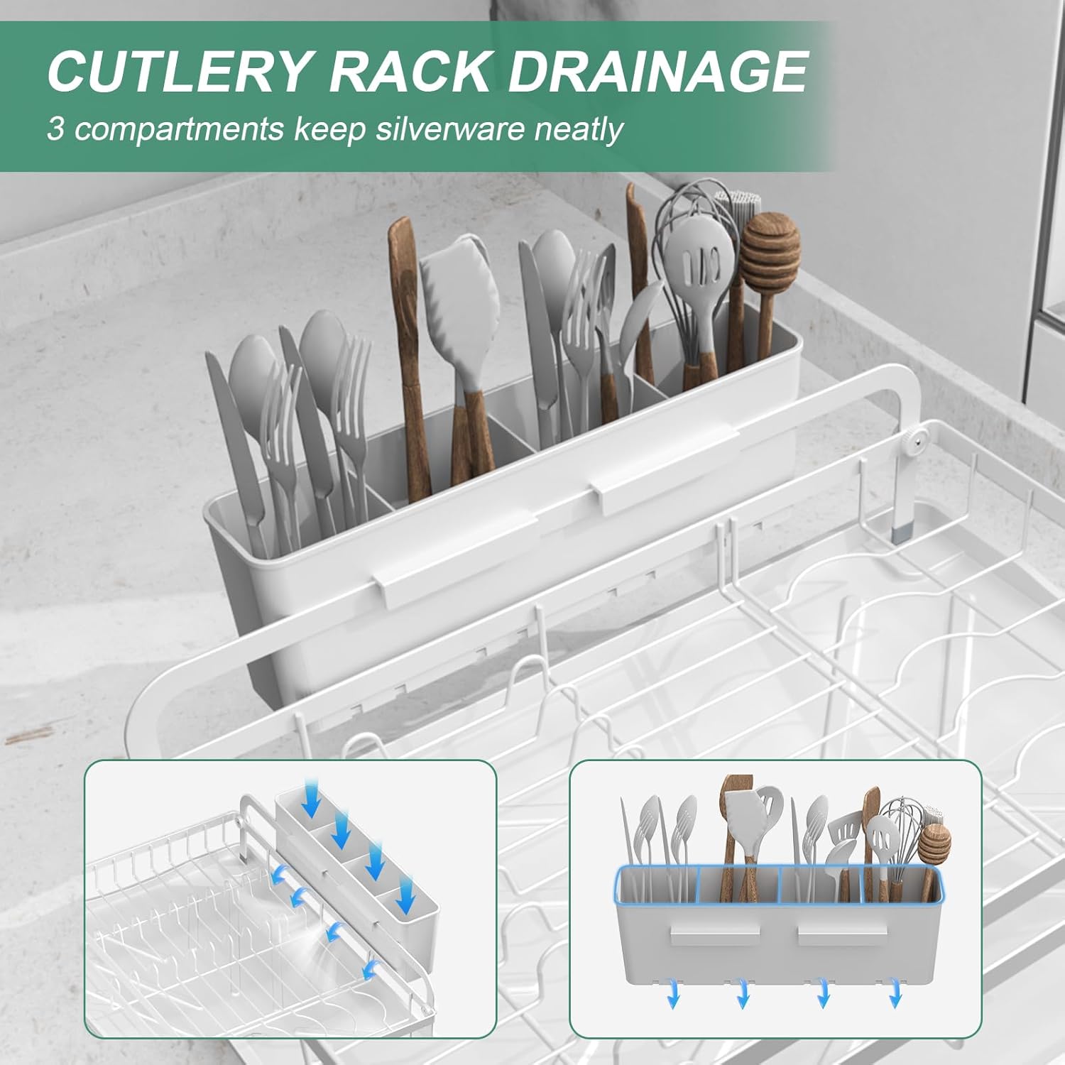 Dish Drying Rack,Dish Racks for Kitchen Counter, Metal Dish Drainer with Adjustable Drainage Spout, Removable Knife and Fork Holder (White)