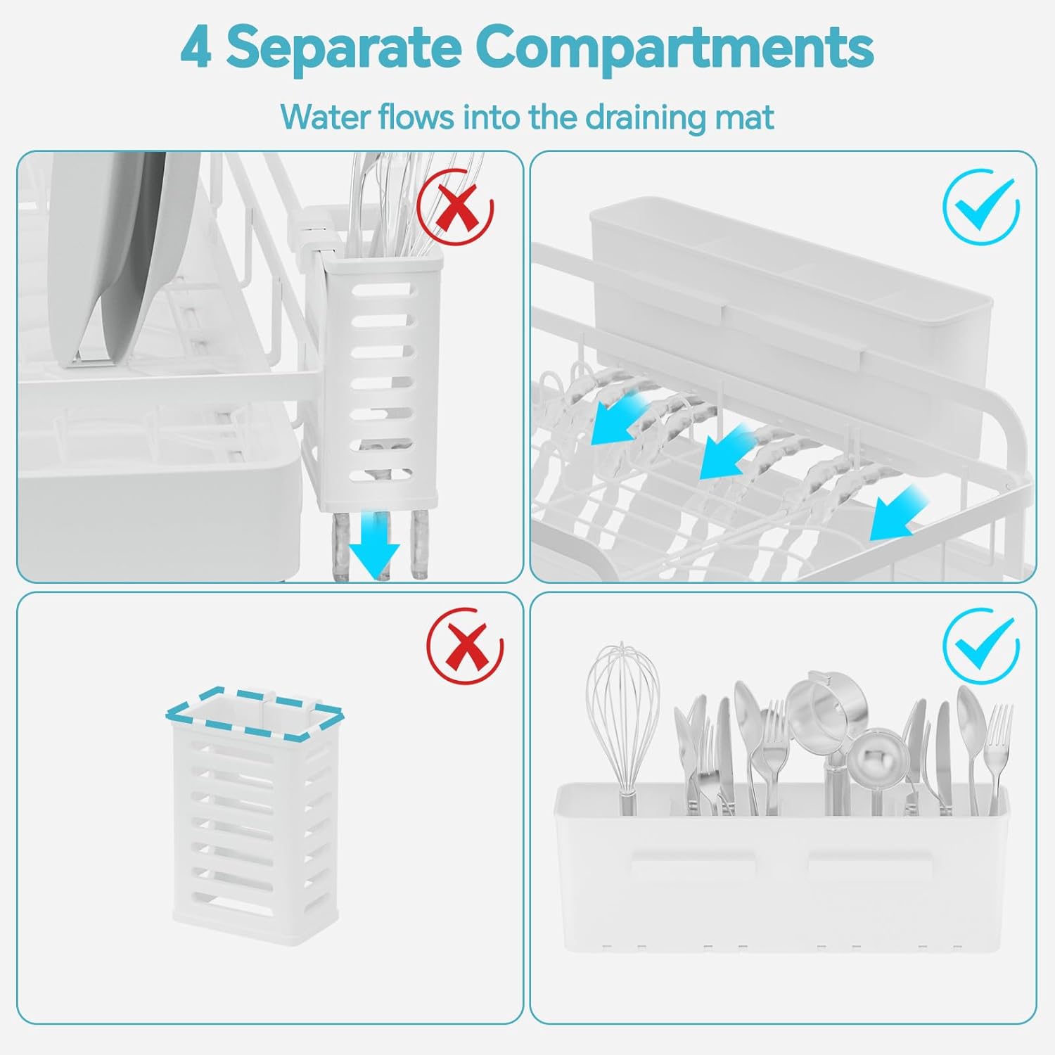 Dish Drying Rack Kitchen - Dish Racks for Kitchen Counter Space-Saving, Dish Drainer with Automatic Drain and Adjustable Spout, Dishwasher Rack with Cutlery Holder, Easy to Install, White