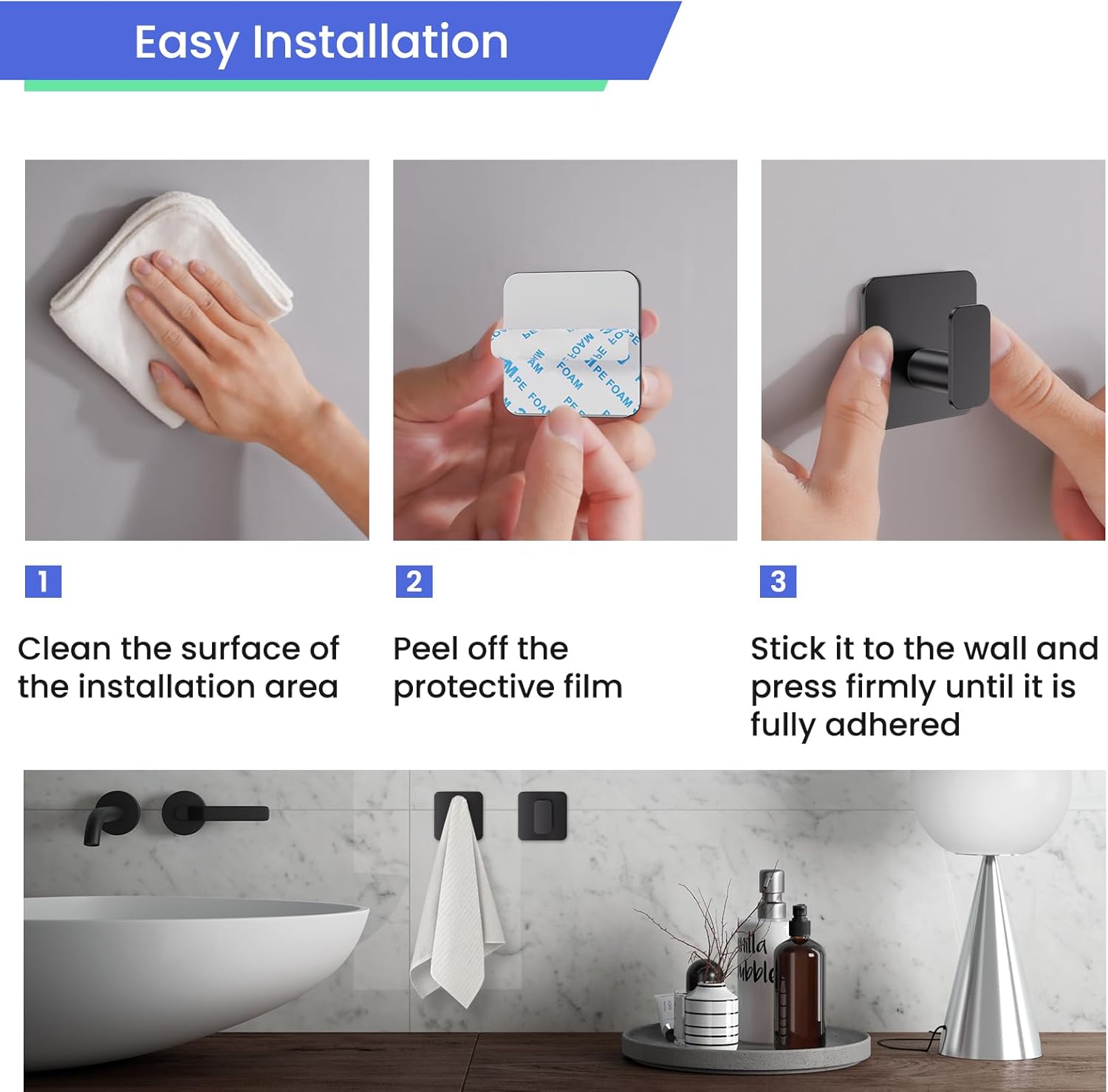 - 【304 Stainless Steel - Waterproof and Rustproof More Durable】 Sticky hooks are made of high quality 304 stainless steel, the surface of the frosted process is scratch-resistant and wear-resistant, waterproof and moisture-proof and rustproof, the bathroom, shower, kitchen, balcony and other humid environments can be used for a long time, goodbye to the ordinary hooks are easy to oxidize the trouble of breakage.