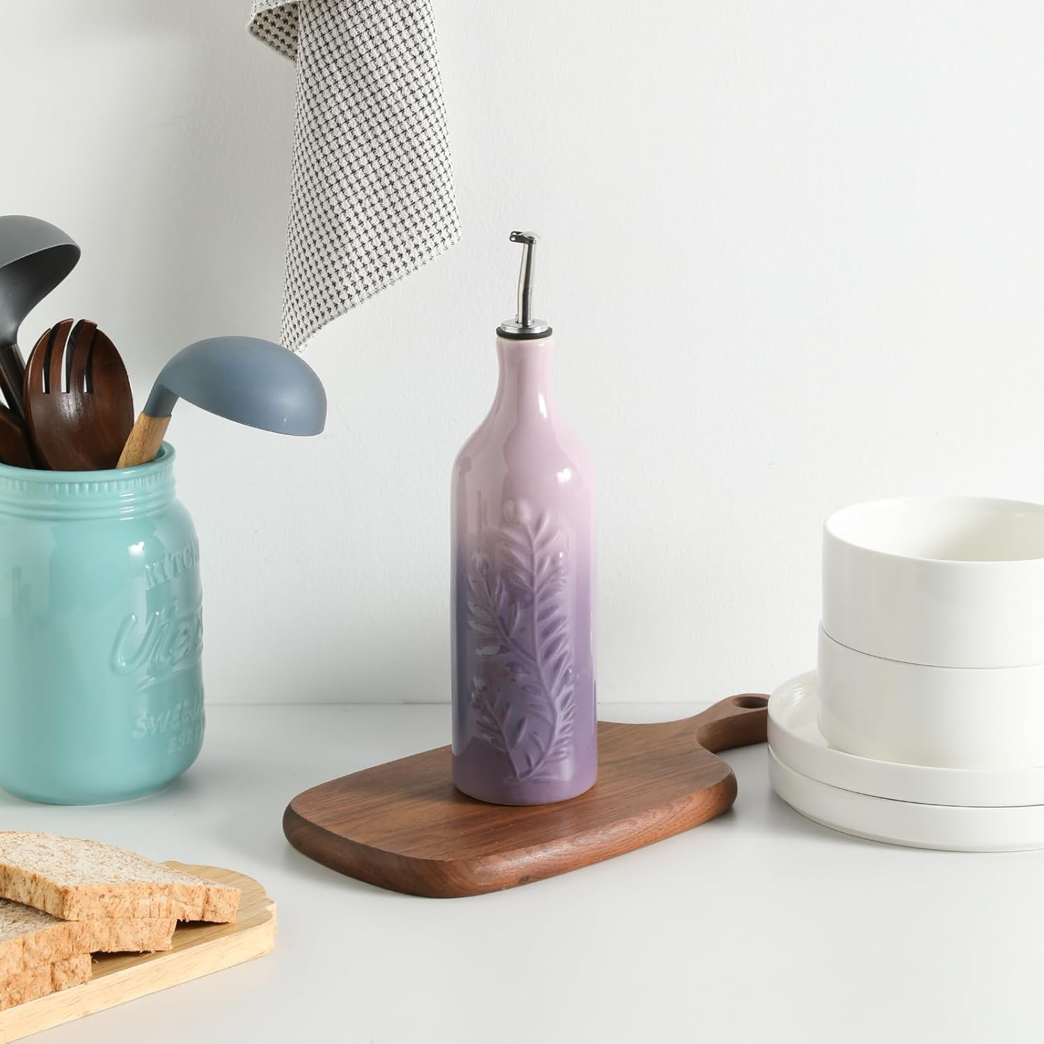 Sweejar Large Olive Oil Dispenser Bottle with Spout, 24 Oz Ceramic Dispenser for Kitchen, Relief Opaque Cruet, Container for Cooking, EVOO, Avocado Oil, Vinegar, Pack of 1(GradientPurple)