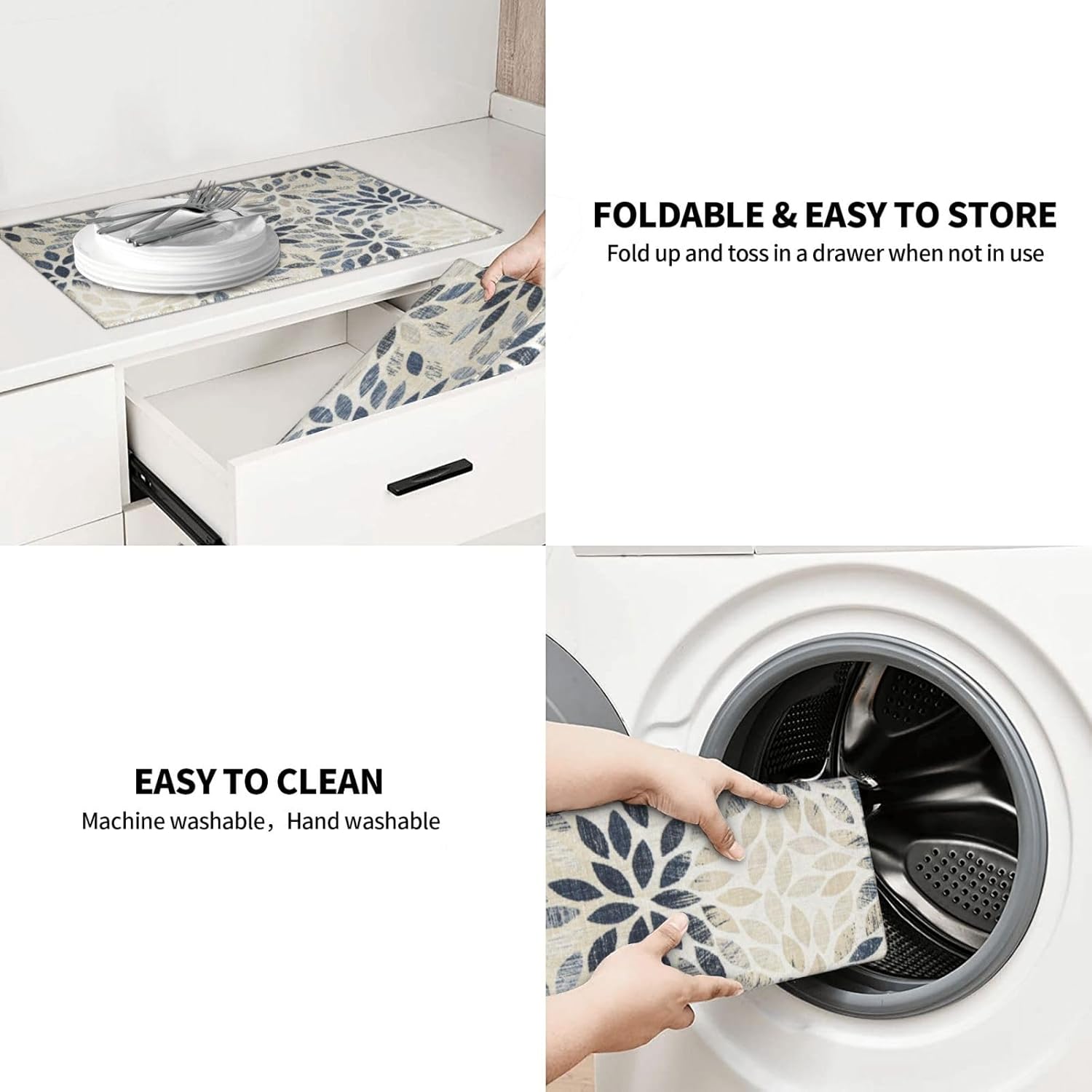 Dahlia Dish Drying Mat 18x24 for Kitchen Counter, Blue Floral Decorative Absorbent Coffee Mat Dish Drying Pad Coffee Bar Dish Drainer Rack Mat Drainer Mat