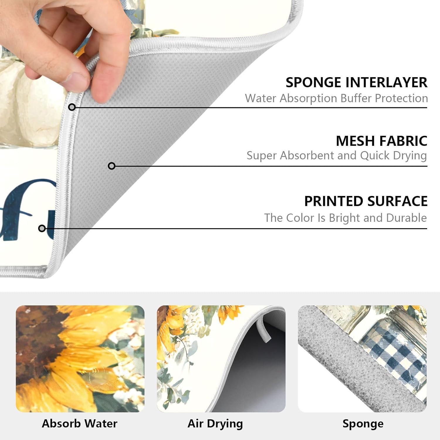 Autumn Pumpkin and Sunflower Floral Vase Dish Drying Mat for Kitchen Counter Absorbent Microfiber Large Drying Pad Dish mats for Kitchen Countertops 18 x 24 Inch