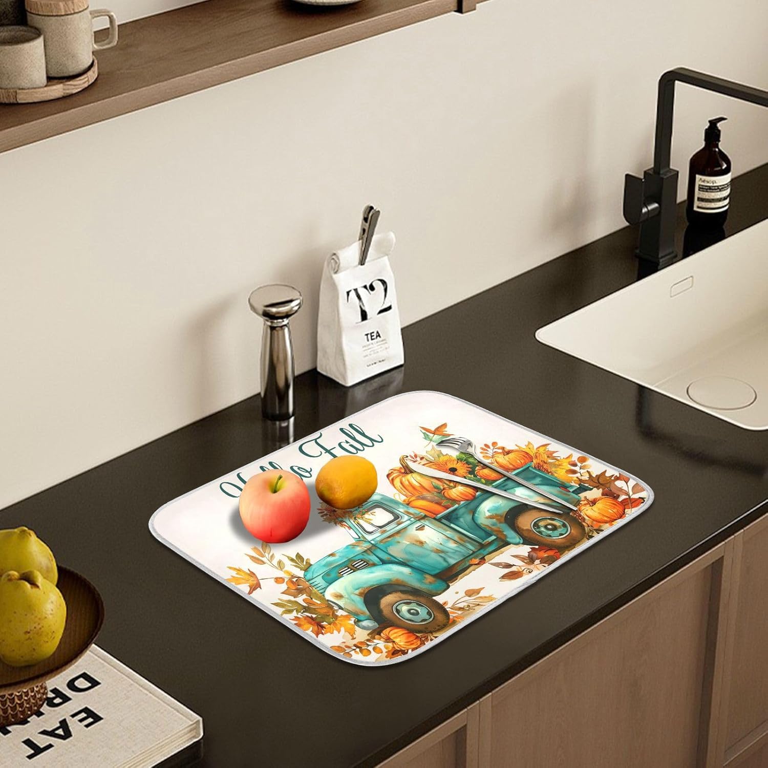 Vintage Fall Truck with Pumpkins Autumn Leaves Dish Drying Mat for Kitchen Counter Absorbent Microfiber Large Drying Pad Dish Mats for Kitchen Countertops 18 x 24 Inch