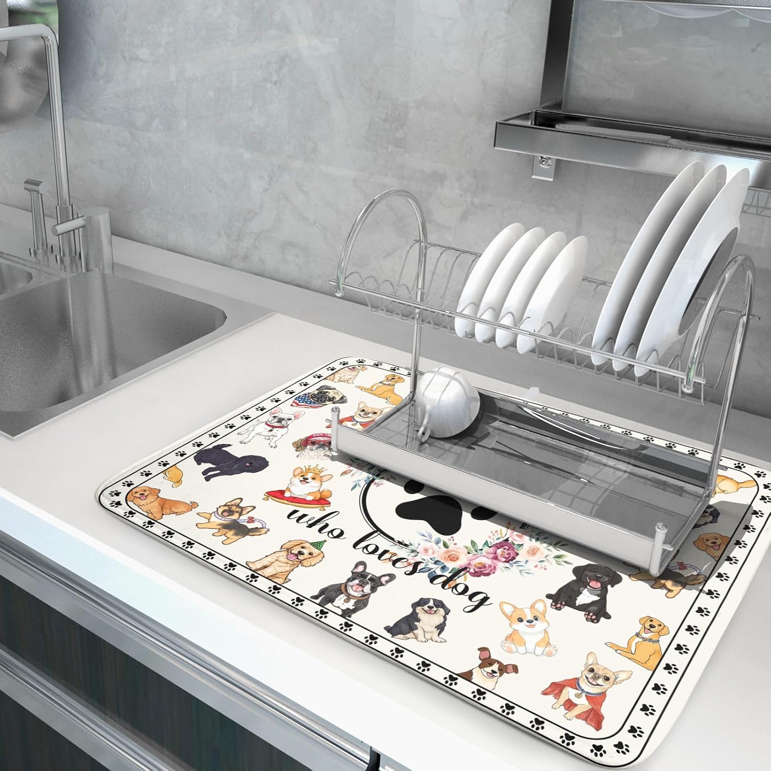 Dog Family Dish Drying Mat Cartoon Pet 18 X 24 in Absorbent Printed Drying Pad for Dog Lover
