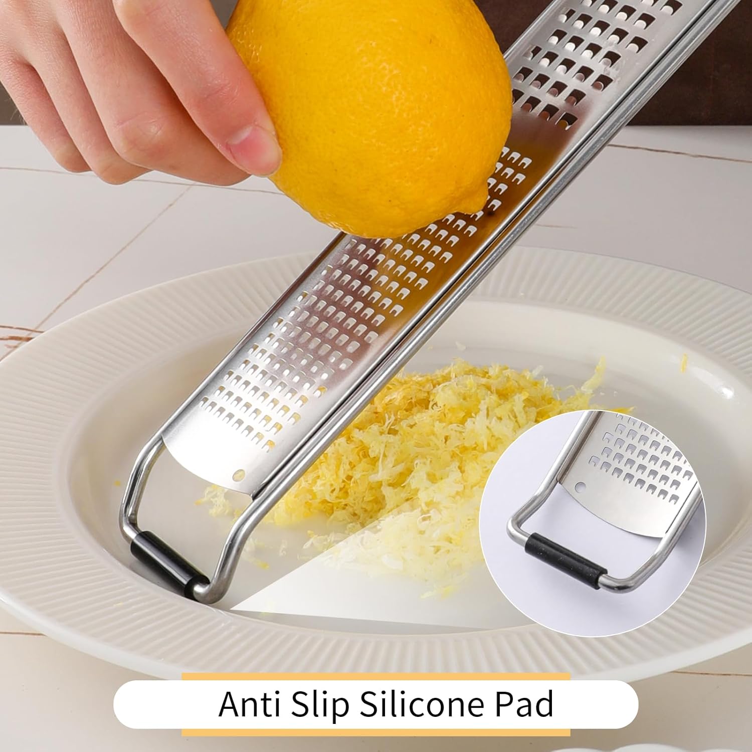 - Comfortable to Use: Hand grater lemon zester has a razor-sharp blade and a comfortable non-slip handle. Handheld cheese graters with non-slip silicone pads, preventing slippage during shredding