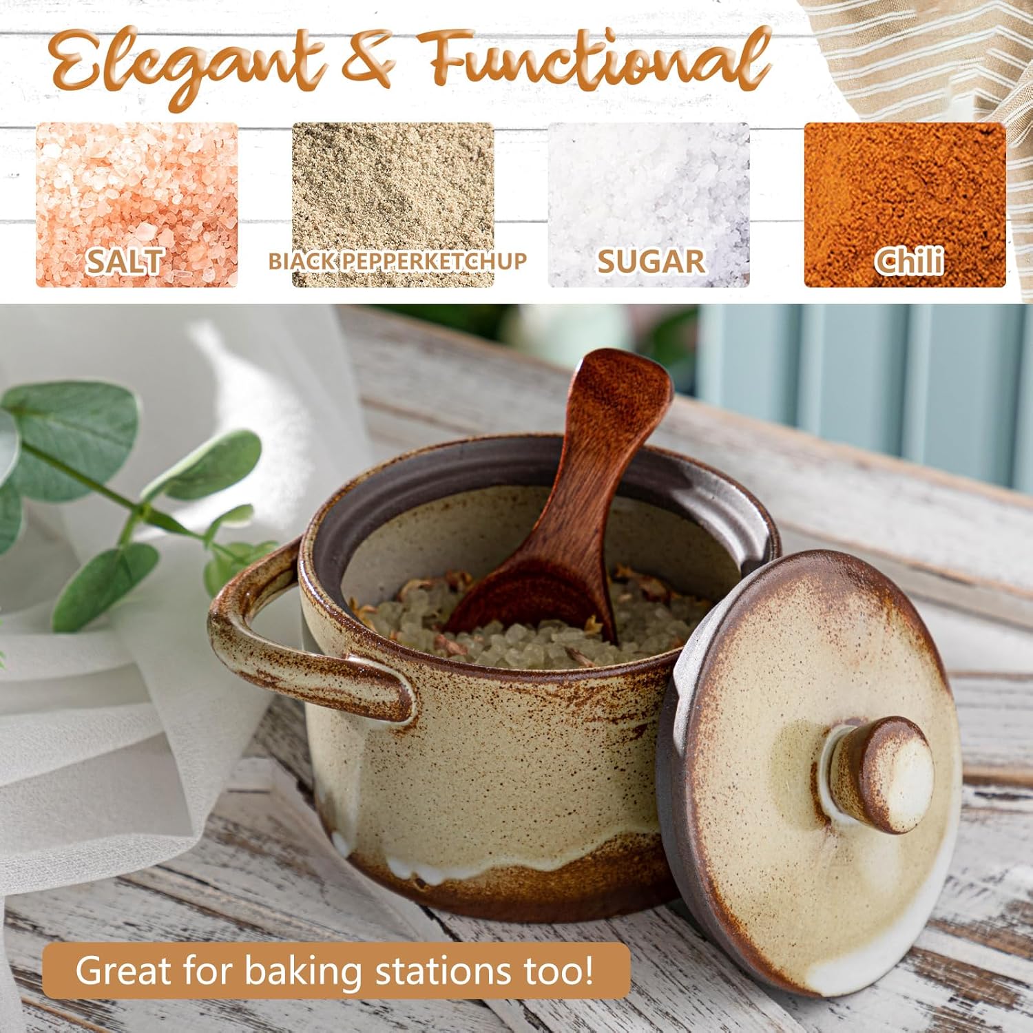 Honeydak Speckled Ceramic Salt Cellar with Lid and Wooden Spoon, Rustic Farmhouse Salt Pepper Cellar Holder for Housewarming Gift, Heavyweight Spices Jar for Kosher, Sea, Sugar(Retro Color)