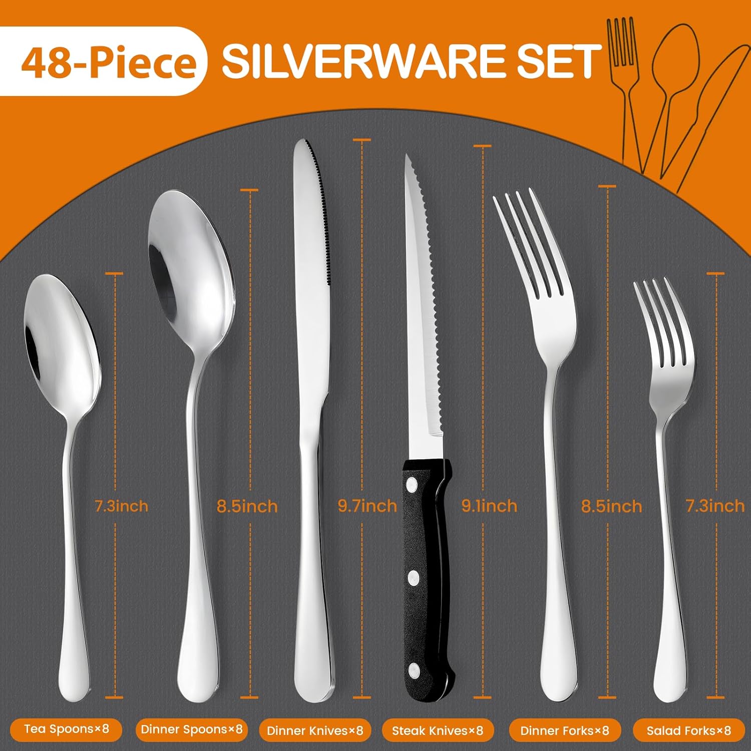 - ă49-PIECE SILVERWARE SET FOR 8ă- The cutlery set Includes 8 dinner forks, 8 salad forks, steak knives set of 8, 8 dinner spoons, 8 teaspoons, and 8 dinner knives, plus a durable 6 compartment organizer - perfect for catering, picnics, weddings, BBQ, holiday dinners, party serving, family reunions and everyday use