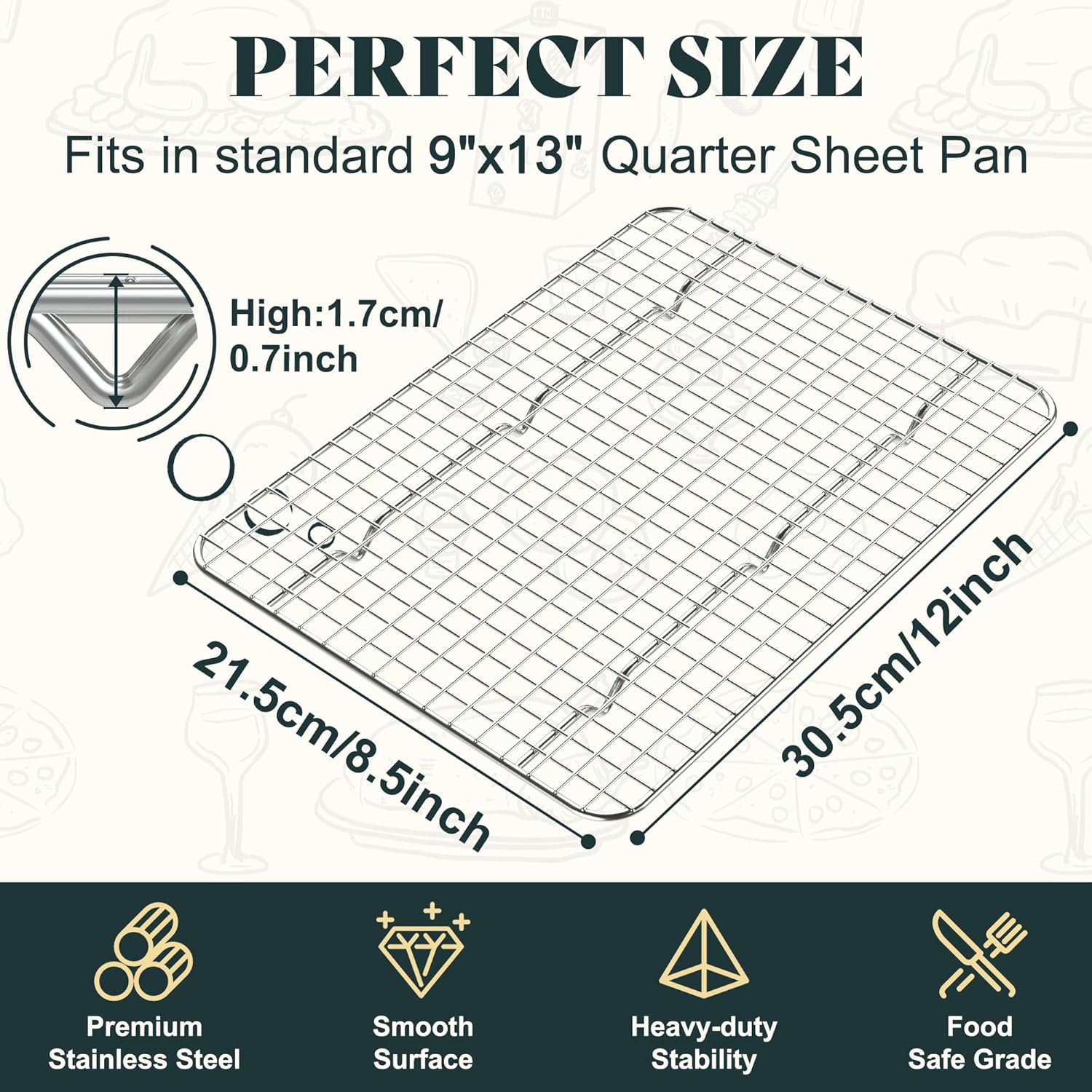 - PERFECT FITS HALF SHEET SIZE: Our cooling racks for baking measures 8.5 x 12x 0.7 inches and is designed to perfectly fit a 9x13 inch Quarter Sheet Pan (baking pan not included). The 6 higher support feet provide better air circulation, making your baking process more efficient, easy, and enjoyable