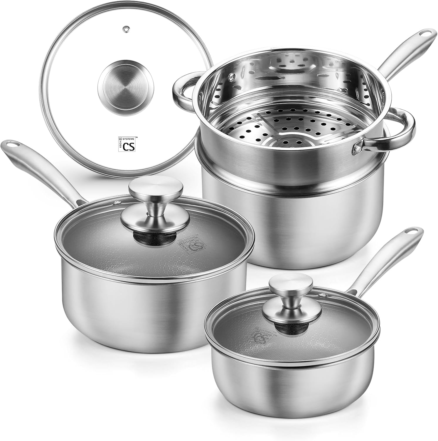KOCH SYSTEME CS Hybrid Nonstick Stainless Steel Saucepan Set with Steamer Insert, 7PCS Triply Stainless Steel Pot Set 1Qt, 2Qt & 3Qt, 18/10 Steel Sauce Pan Set with Lids, Induction & Oven Safe