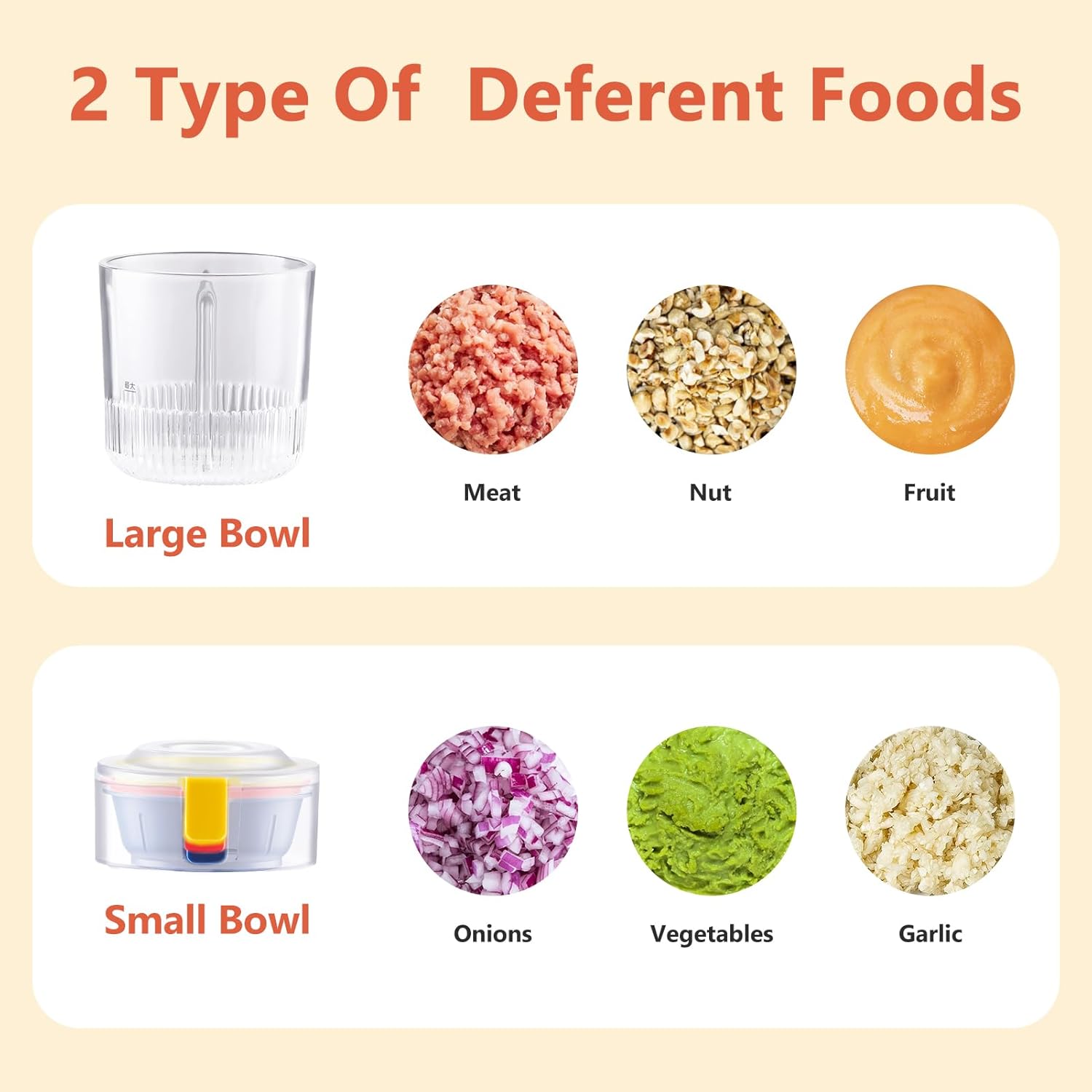 - ăPortable Small Food ChopperăIncludes 1 large glass bowl (500 ml/2 cups) and 3 small PP bowls (100 ml/0.5 cups) with dual stainless steel blades (large for chopping meat/vegetables, small for chopping spices/herbs). The main unit is constructed with ABS plastic that's shockproof, heat-resistant, and completely safe for food preparation. Dishwasher-safe and easy to clean(motor base excluded).