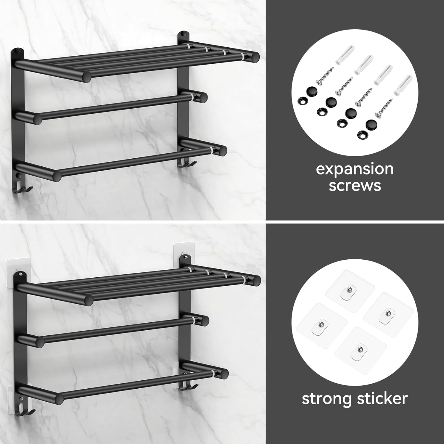 - 【 Easy installation 】: Without drilling holes, the towel rack can be installed using our matching adhesive to protect the wall; The towel rack can also be drilled and installed with screws.