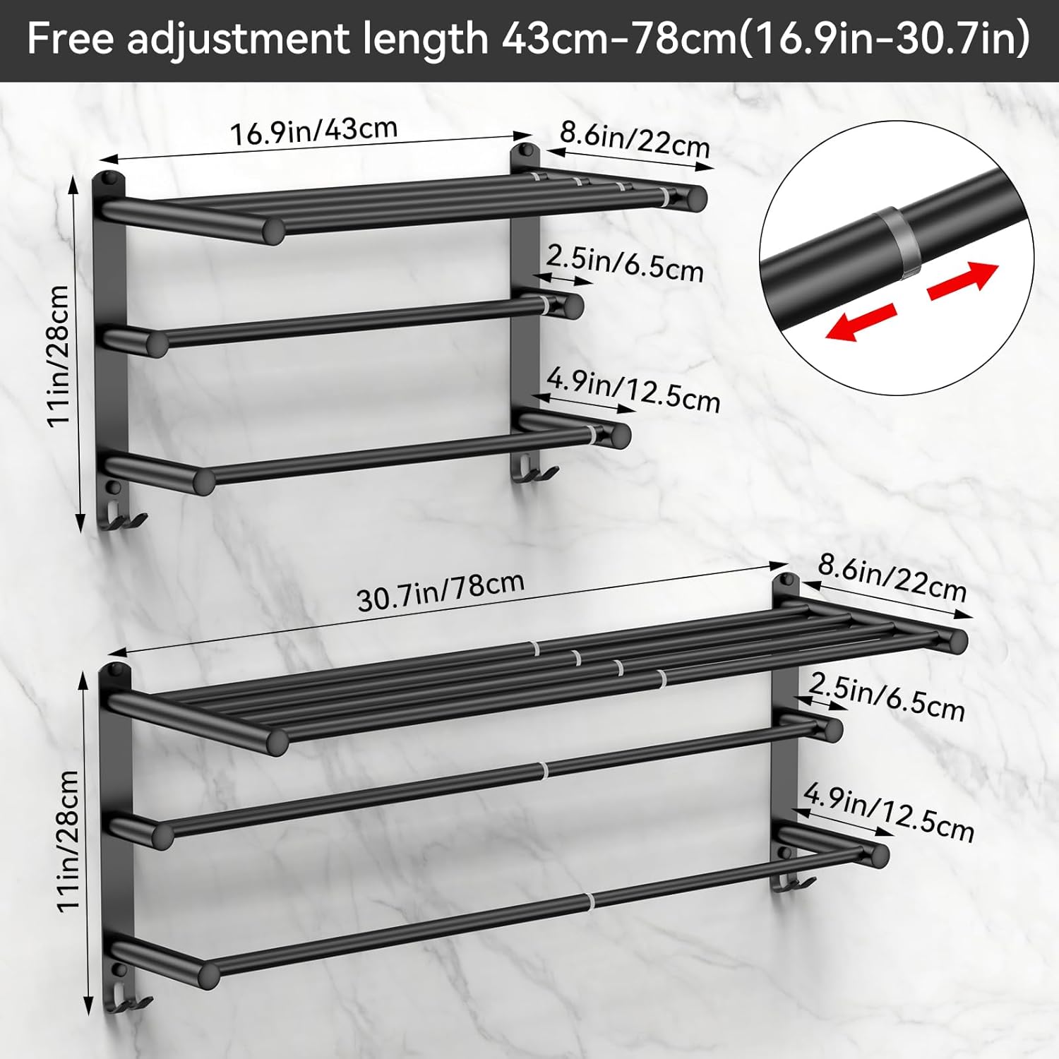 - 【 Scalable Design 】: The towel rack can be freely adjusted in length from 17 inches to 30.7 inches【43-78CM】, which can be adjusted as needed in limited space to improve space utilization.