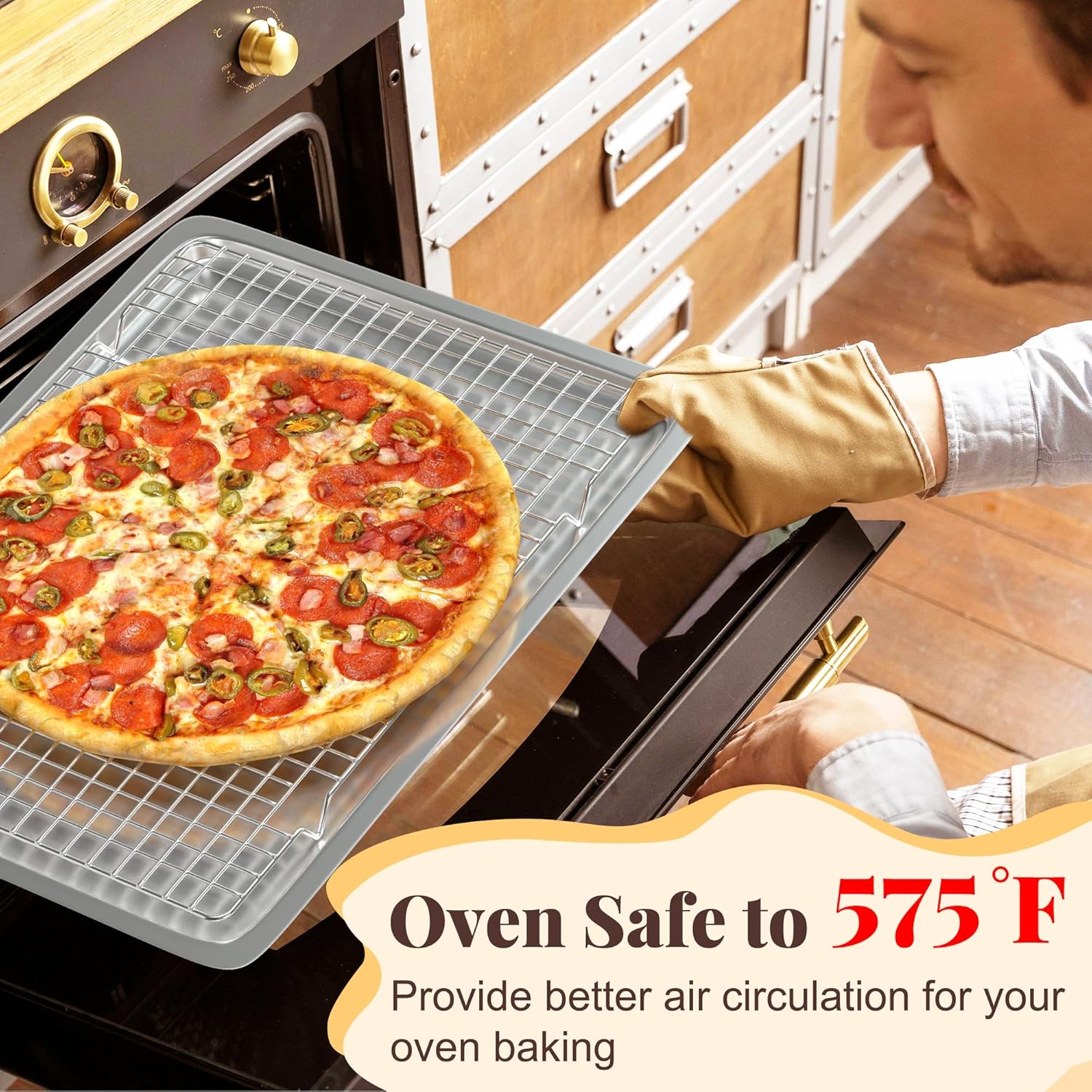 - OVEN οΌ DISHWASHER SAFE: This wire rack for baking sheet has excellent heat resistance up to 575β oven baking, you can safely use it for roast, grill, smoke, dry. Besides, you can safely put the bread cooling rack into the dishwasher for cleaning. If need to hand wash, just soak it in mild soapy water and the stains will be easily removed