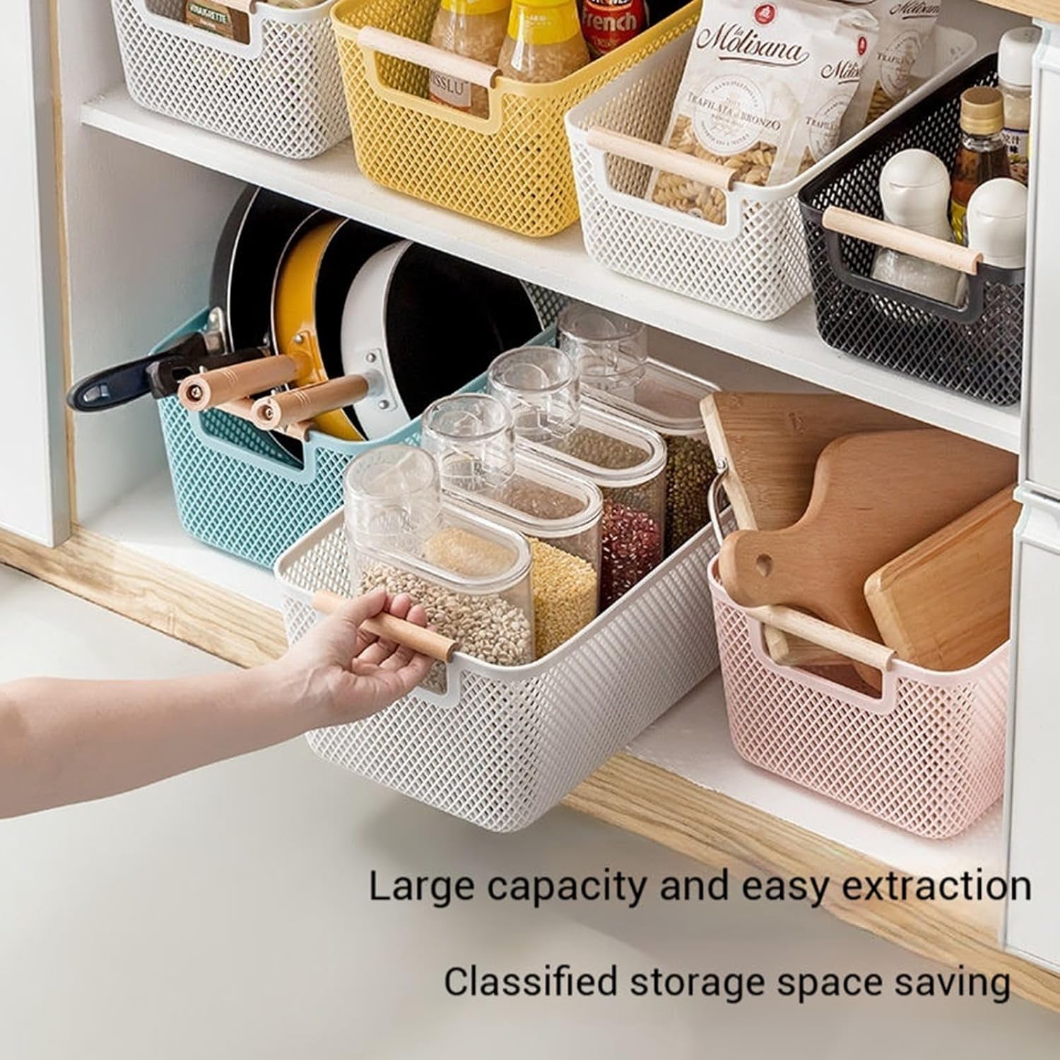 - The metal mesh storage organizer basket bin with wooden handle is a great way to organize or decorate your home, office, apartment, lofts, or other living spaces. This wire basket also can be a fruit basket or garden basket and storing those fruits and vegetables outside the refrigerator. Also as extra storage to meet your needs for household use.