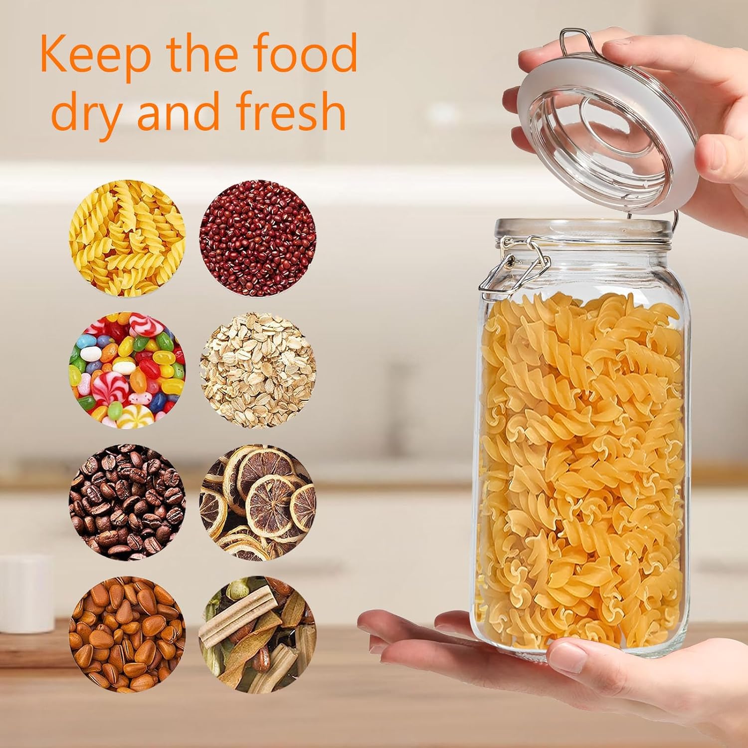 - 2.Airtight Seal Lids โ Glass jars with airtight lid is made of food-graded glass; Each kitchen canisters for countertop is well sealed, equipped with silicone gasket and a stainless iron locking clamp to make sure your food stay clean and fresh in storage