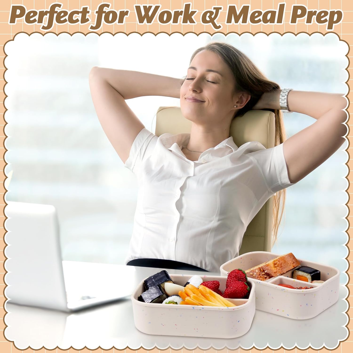 Honeydak 4 Pcs Silicone Bento Lunch Box 3 Compartment Reusable Leakproof Silicone Bento Lunch Container for Adults Microwave Dishwasher Freezer Safe(Beige)
