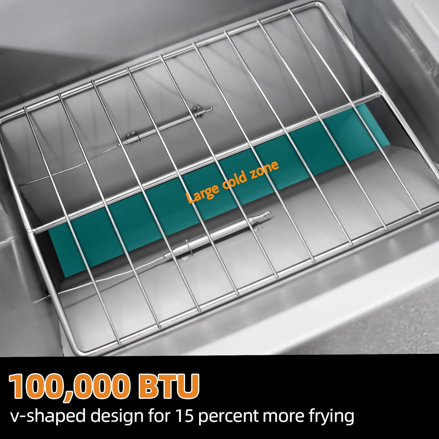 - Rapid Drain & Ultra-Efficient Heating:Boost productivity with fast draining (90-second oil evacuation) and intense 100,000 BTU heating that slashes preheat time by 50%. The floor-standing design’s flame-to-plate system encircles the pot for uniform cooking, while the full port valve ensures zero residue. CSA-certified and NSF-ready for food trucks needing reliability—fry faster, clean smarter!