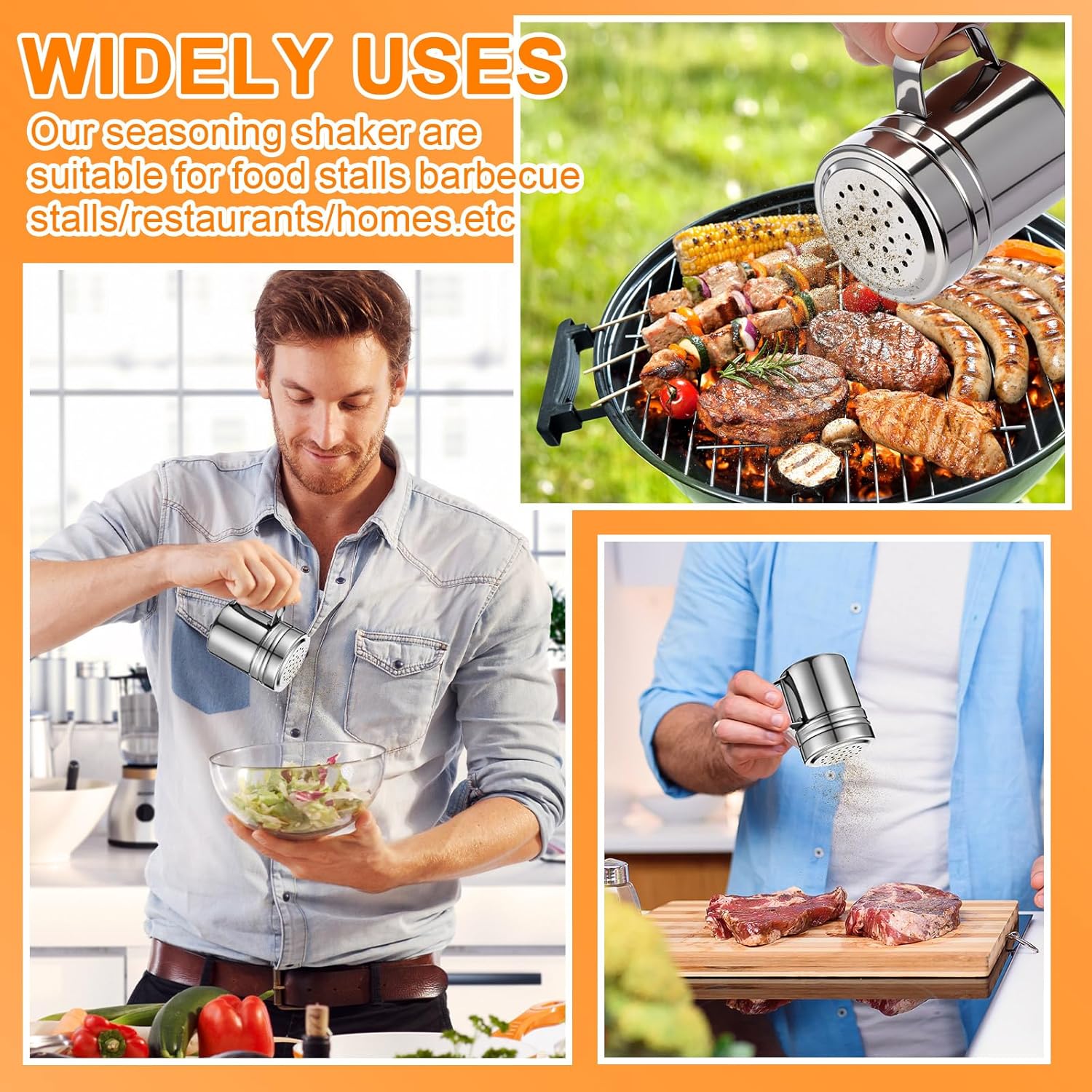- Proper Size to Apply: the stainless steel dredge shakers with lid and handle are approx. 3.1 x 2.2 inches/ 7.8 x 5.5 cm and have a capacity of 6oz, The 6oz is the most common standard size for other spices, which avoids dust and water vapor from entering the bottle through the hole and keeps salt and pepper dry; The handles on one side help you to pick them up easily and make them more convenient to use