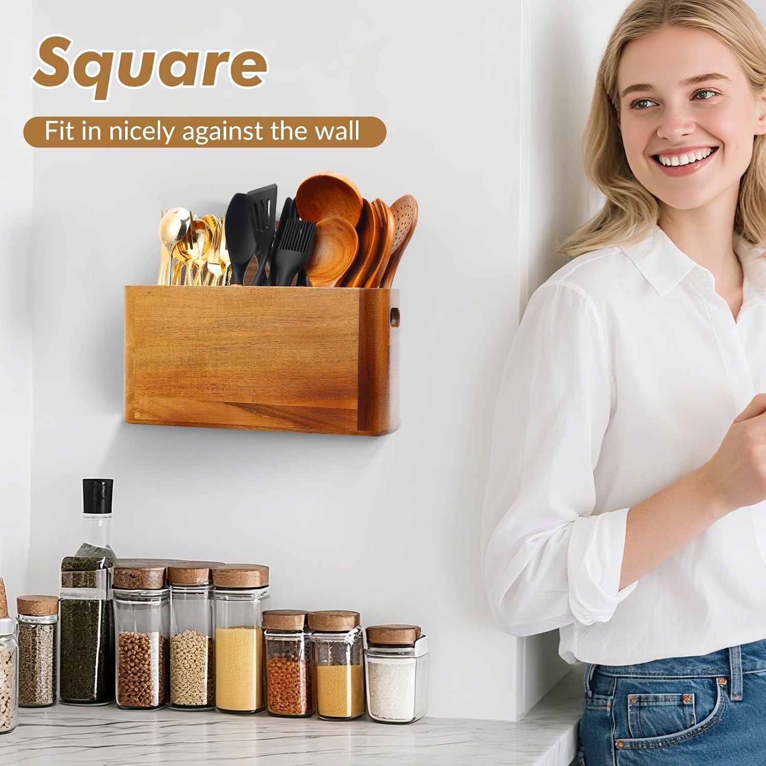 - Stylish & Functional Rustic Minimalist Design: The cooking utensil holder is made from high-quality acacia wood with a waterproof varnish finish. Showcases beautiful natural wood grain for a warm, rustic look. Makes a perfect gift for home chefs and cooking enthusiasts!