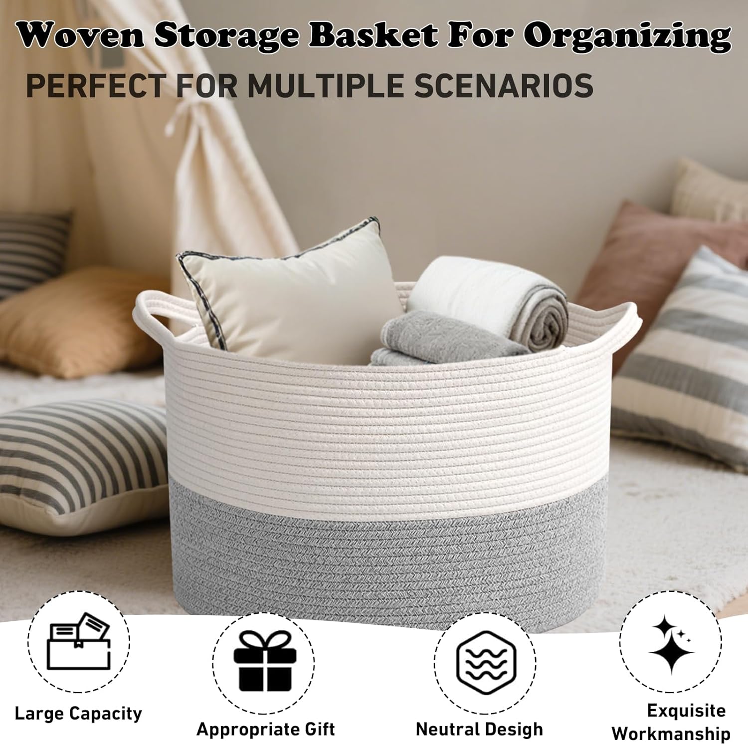 Large Blanket Basket for Organizing,115L Closet Organizers and Storage Bins Box for Shelves Woven Rope Storage Baskets,Living Room,Bedroom,Dorm,Laundry room (White&Grey)