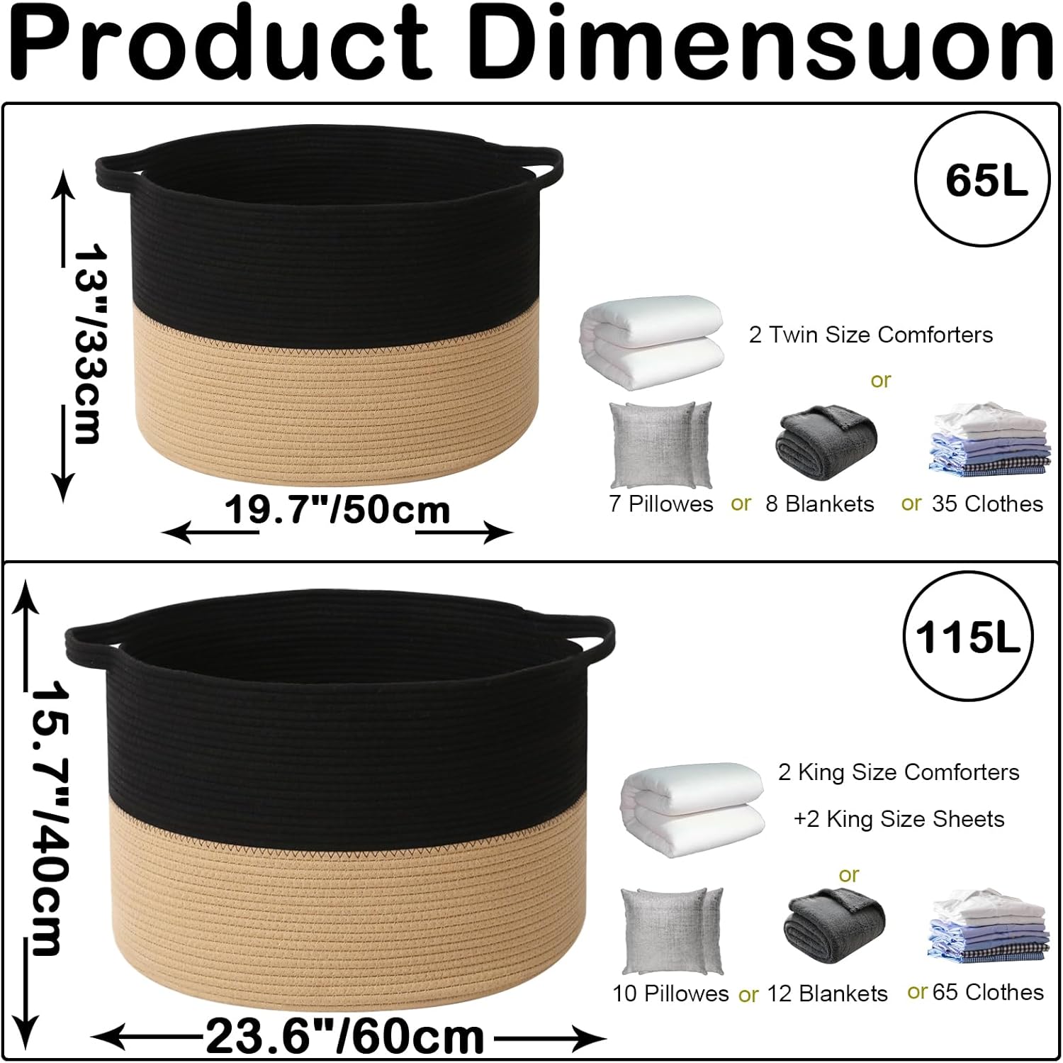 Large Blanket Basket for Organizing,115L Closet Organizers and Storage Bins Box for Shelves Woven Rope Storage Baskets,Living Room,Bedroom,Dorm,Laundry room (Black&Camel)