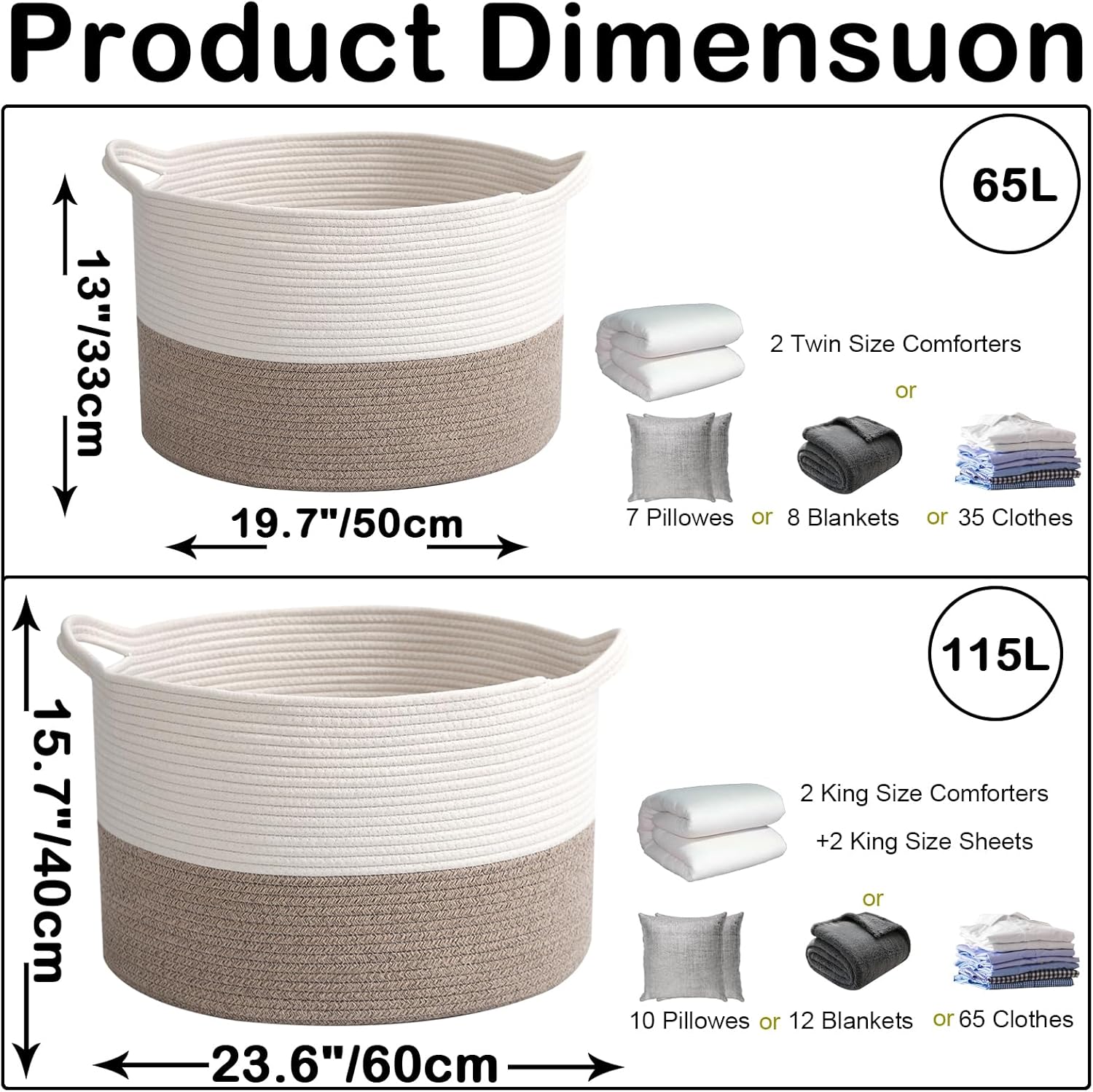 - 【Large Laundry Blanket Basket】19.7"L x 19.7"W x13"H Laundry basket for organizer,65L rope large cotton blanket basket with handle.Please allow 1 - 2 cm (0.4" - 0.8") for deviations due to folded transportation