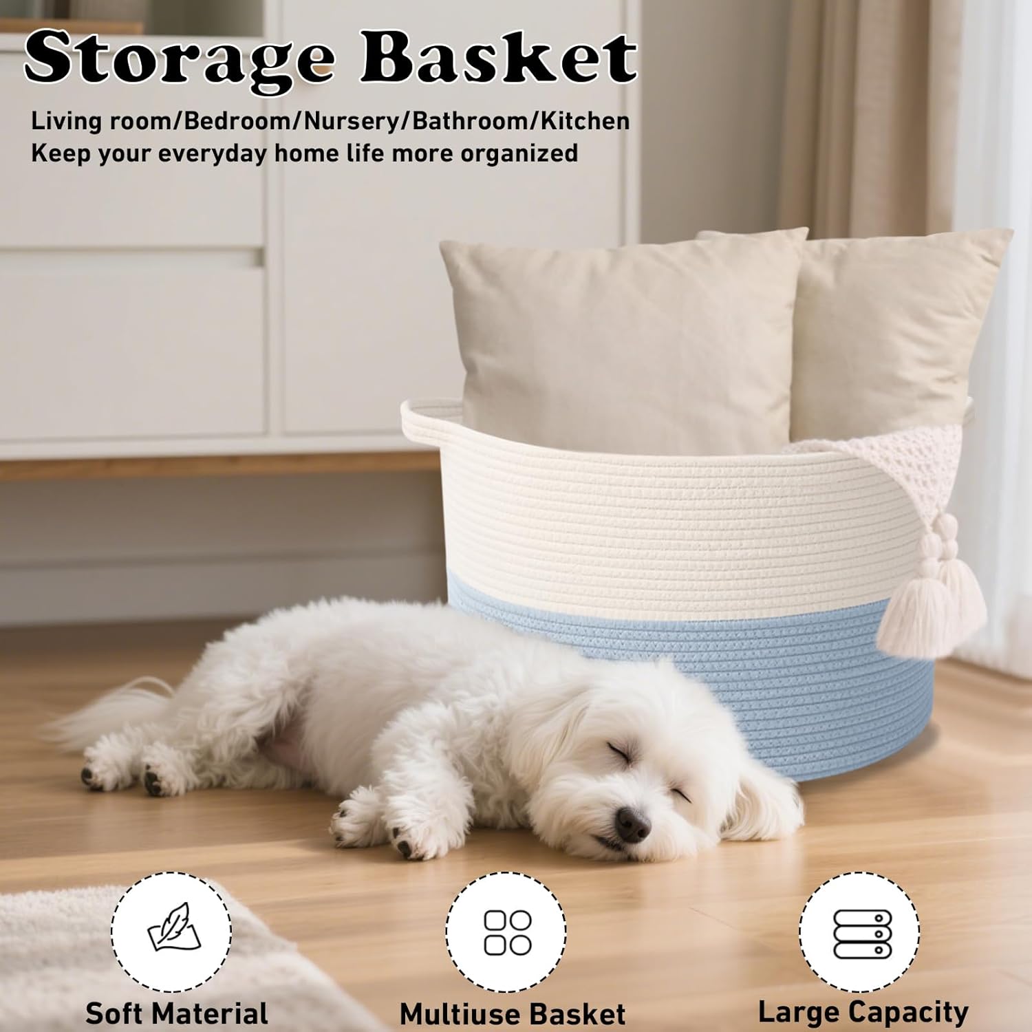 Large Blanket Basket for Organizing,115L Closet Organizers and Storage Bins Box for Shelves Woven Rope Storage Baskets,Living Room,Bedroom,Dorm,Laundry room (White&Blue)