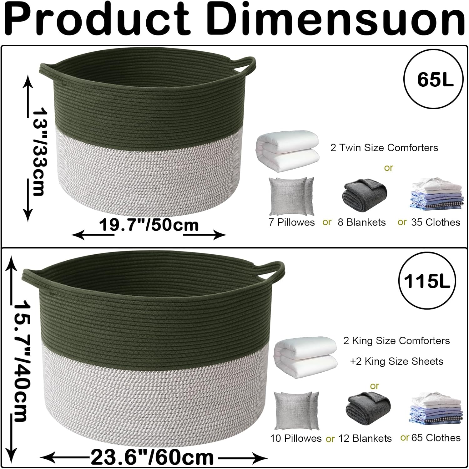 - 【Large Laundry Blanket Basket】23.6"L x 23.6"W x15.7"H Laundry basket for organizer,115L rope large cotton blanket basket with handle.Please allow 1 - 2 cm (0.4" - 0.8") for deviations due to folded transportation