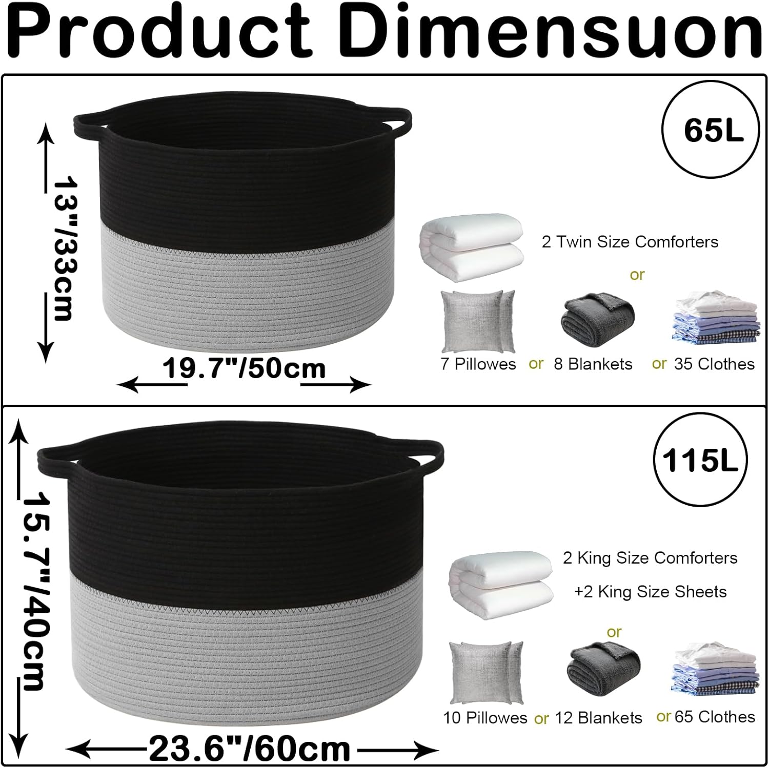 - 【Large Laundry Blanket Basket】23.6"L x 23.6"W x15.7"H Laundry basket for organizer,115L rope large cotton blanket basket with handle.Please allow 1 - 2 cm (0.4" - 0.8") for deviations due to folded transportation