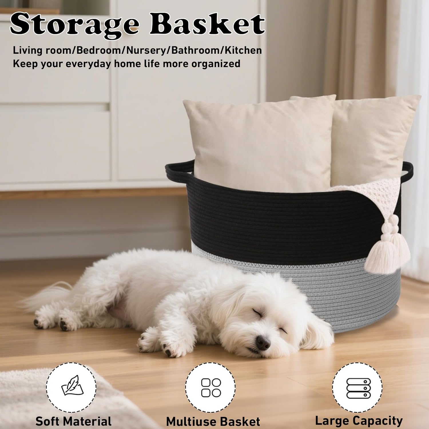 - 【Sturdy Handle Design】The two built-in handles are sturdy, easy to carry or move and allow you to pack up their alone. The woven basket is made of cotton rope, which is soft yet holds its shape well.No need to worry about scratching clothes or hurting skin, suitable for families or pets