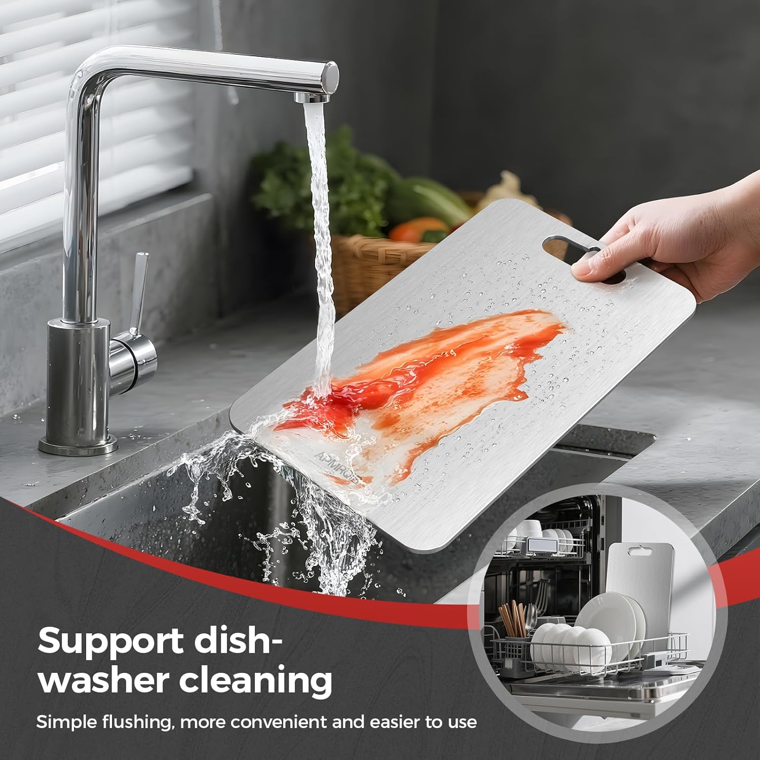 - 【Sturdy and Durable】: Engineered from a single piece of titanium without any glue or adhesives, these cutting boards are non-toxic and built for long-lasting durability. They can withstand the rigors of daily use, being highly resistant to notches and punctures from sharp knives. The wire-drawn surface treatment creates a smooth, pore-free finish that resists staining and odor absorption