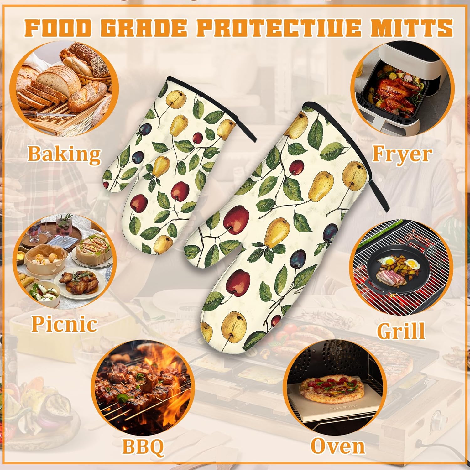 Retro Fruit Oven Mitts and Pot Holders Set,Cherry Kitchen Oven Gloves and Pot Holder with Heat Resistant Non Slip for Cooking Baking Grilling(4 Piece Set)