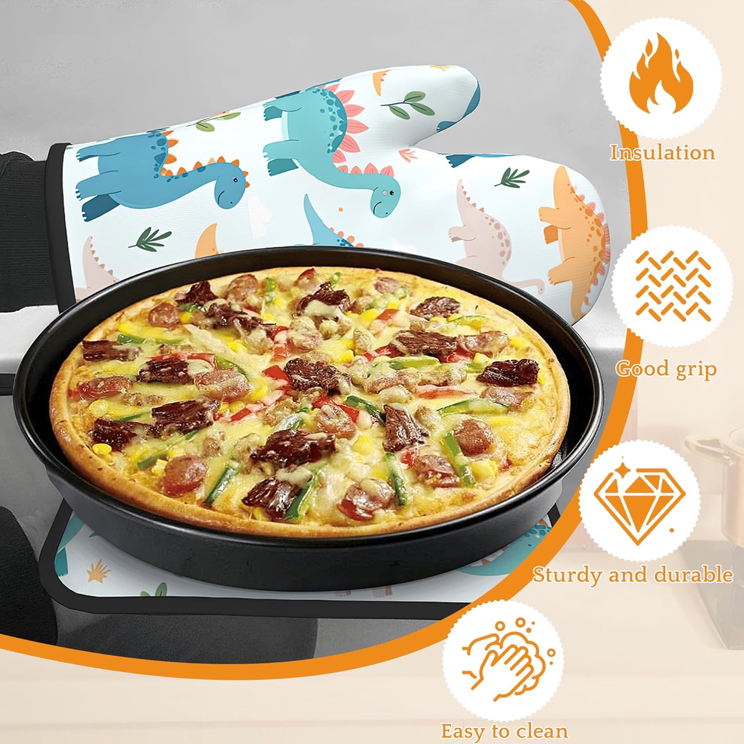 Cute Dinosaur Oven Mitts and Pot Holders,Heat Resistant Oven Mitts Gloves and Pot Holder for Home Kitchen Decorations Cooking Baking BBQ Gifts,Set of 4