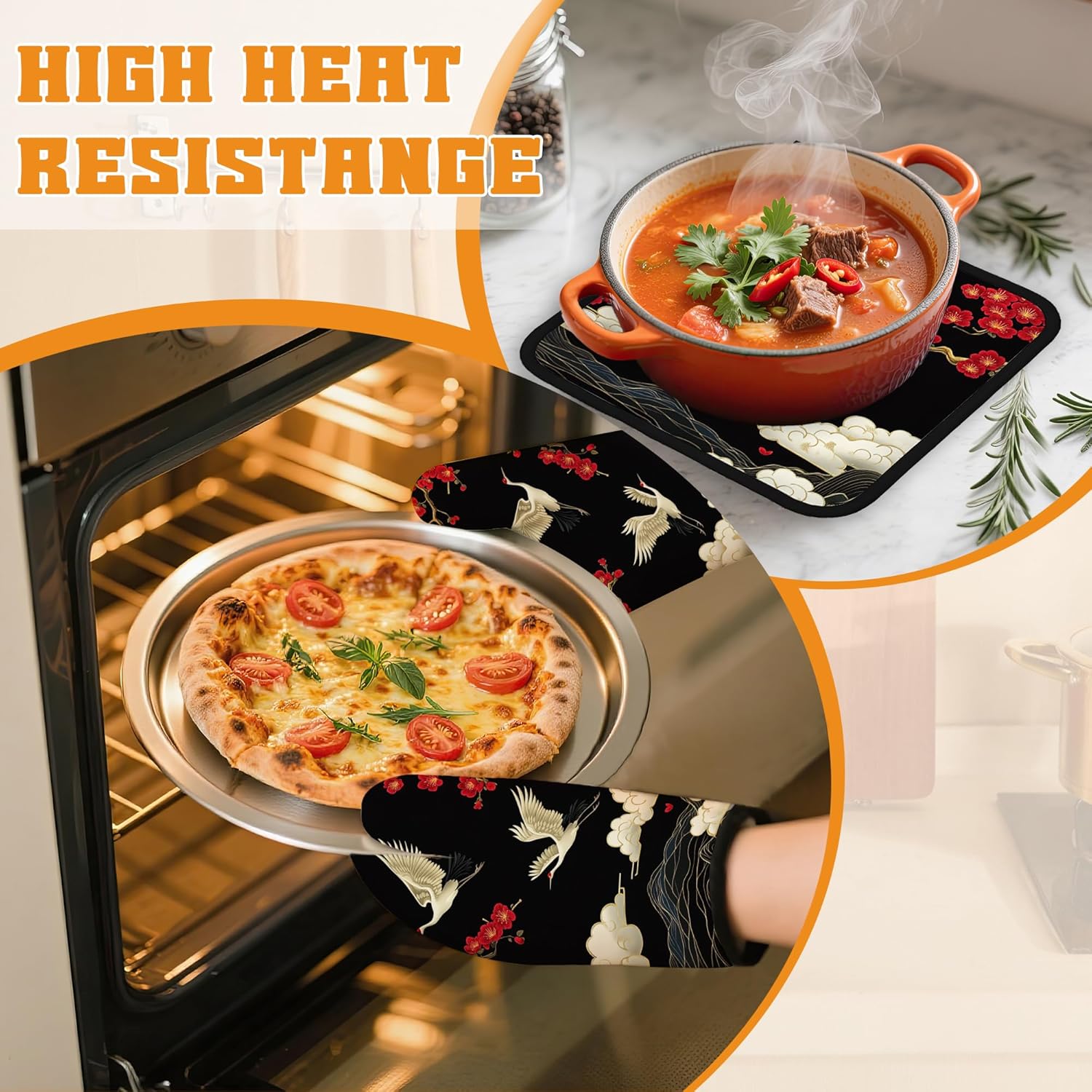 Japanese Crane Oven Mitts and Pot Holders Set,Cherry Blossom Kitchen Decor Heat Resistant Non Slip Hot Pads and Oven Mitt for Chef Cooking Baking BBQ Mom Girl Gifts(4 Piece Set)