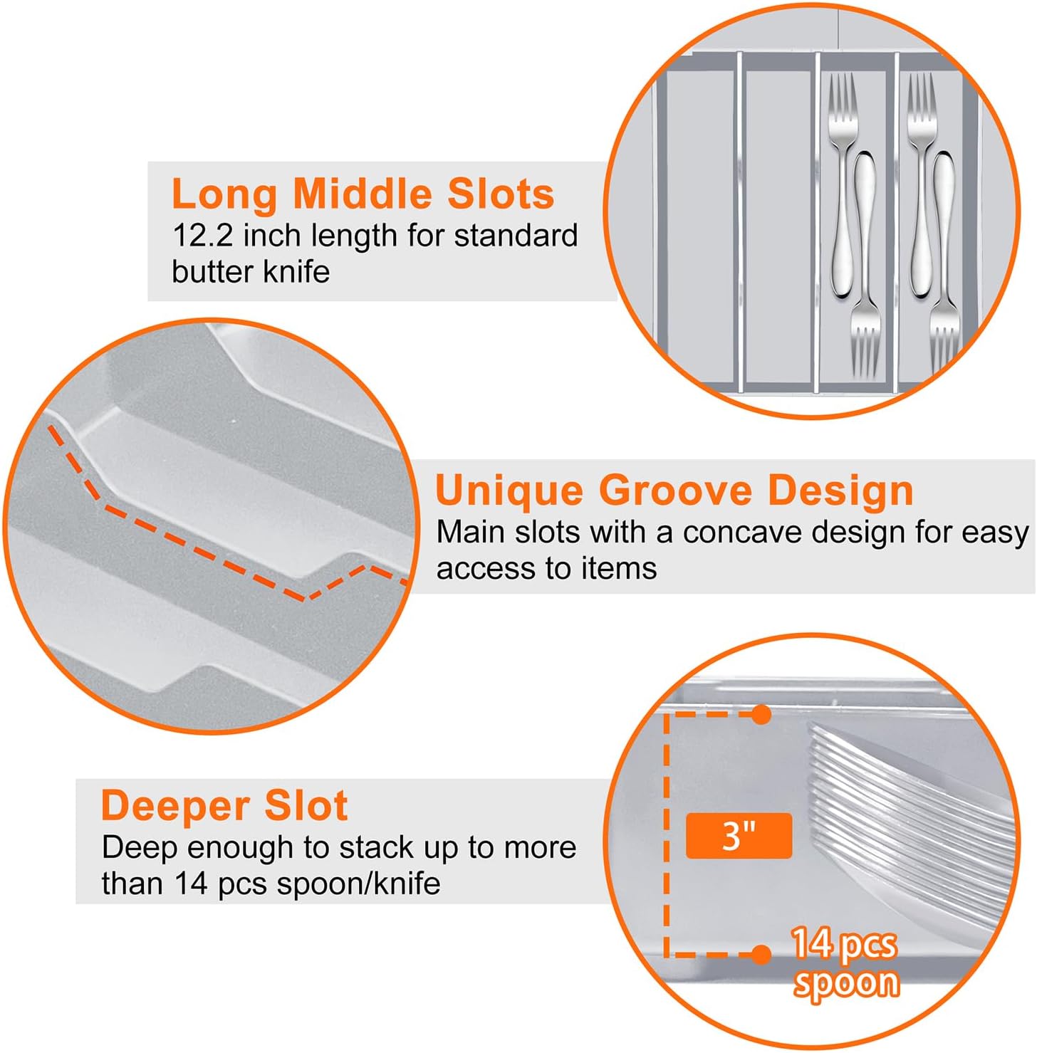 - Maximize Drawer Space: With our 3-way expandable design, this gray silverware organizer offers unparalleled flexibility, allowing for left, right, and upward expansion. This transforms it from a compact tray to a full-sized storage solution. All the edges are thinner than those of other cutlery drawer organizer, which magnifies your kitchen drawer storage space