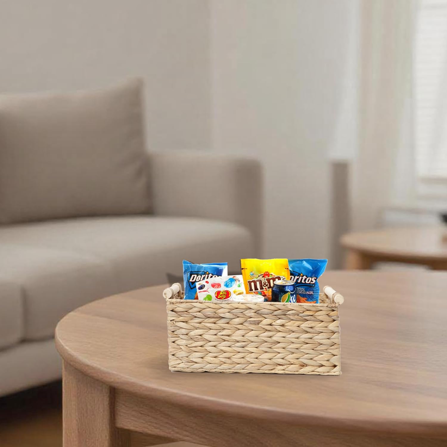 Handmade Water Hyacinth Woven Storage Baskets with Wooden Handles, Rectangle Rustic Organizer Set for Home Decor, Kitchen, Bedroom & Office (Small)