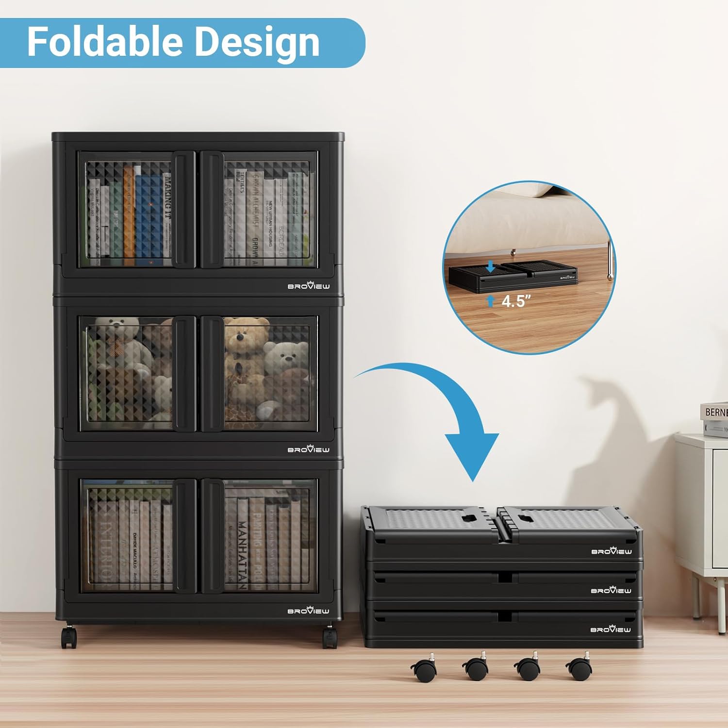 300Qt Stackable Storage Bins with Lids, 75Gal Closet Organizers and Storage Drawer, Plastic Collapsible Storage Bins with Doors, Heavy Duty Store Box Cabinet for Home Office, 3Pack Black