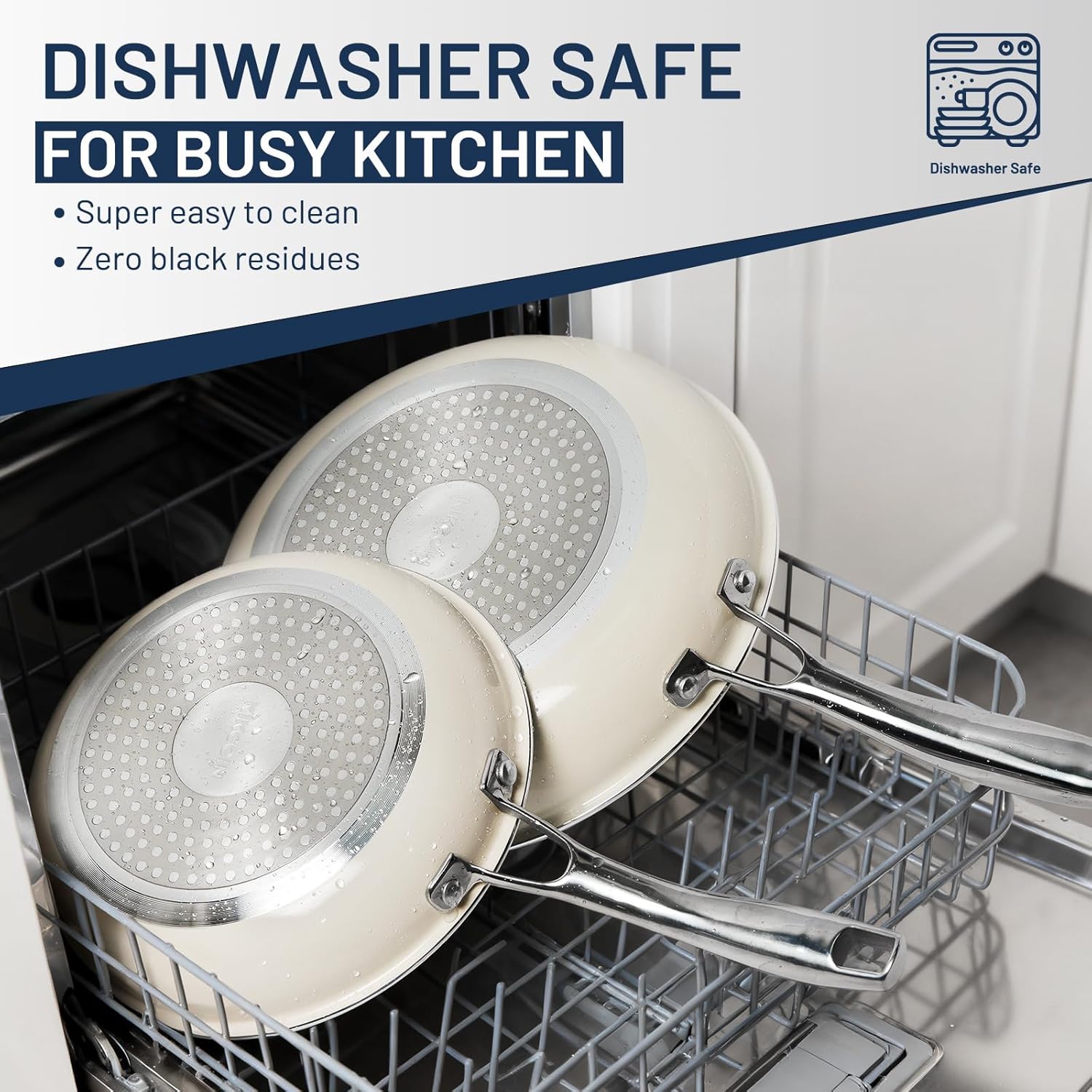 - 【BUSY KITCHEN SAVOR】For the messy busy kitchen, our ceramic cookware pans are lifesaver, you won’t spend 10 minutes scrubbing burnt gunk; just rinse with soapy warm water, wipe with a towel, these skillets would keep brand new. Dishwasher safe, and Never get black residues issues.