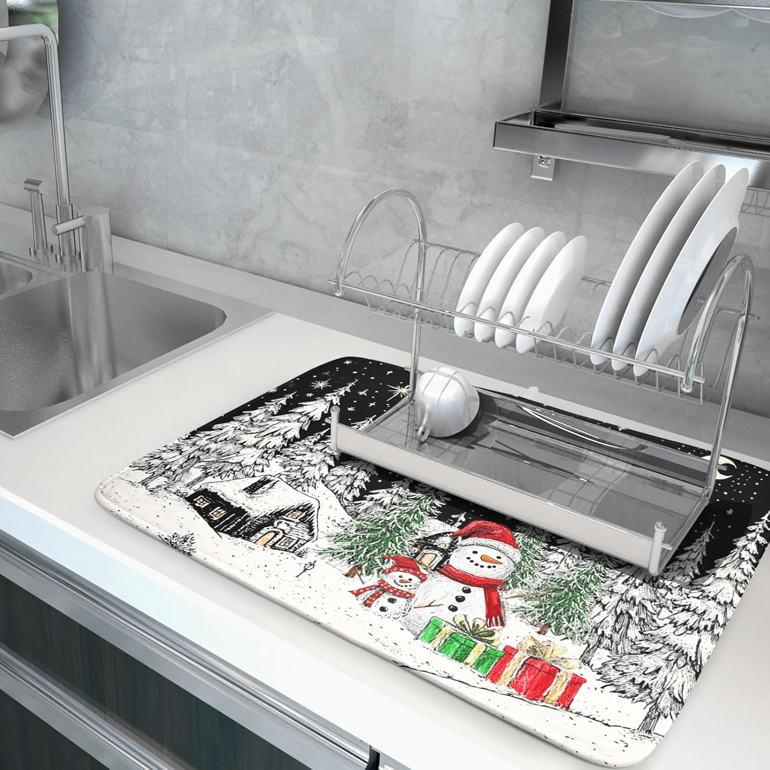 Winter Snowman Dish Drying Mat 24 X 18 in Black Microfiber Dish Pad Absorbent Holiday Kitchen Accessories