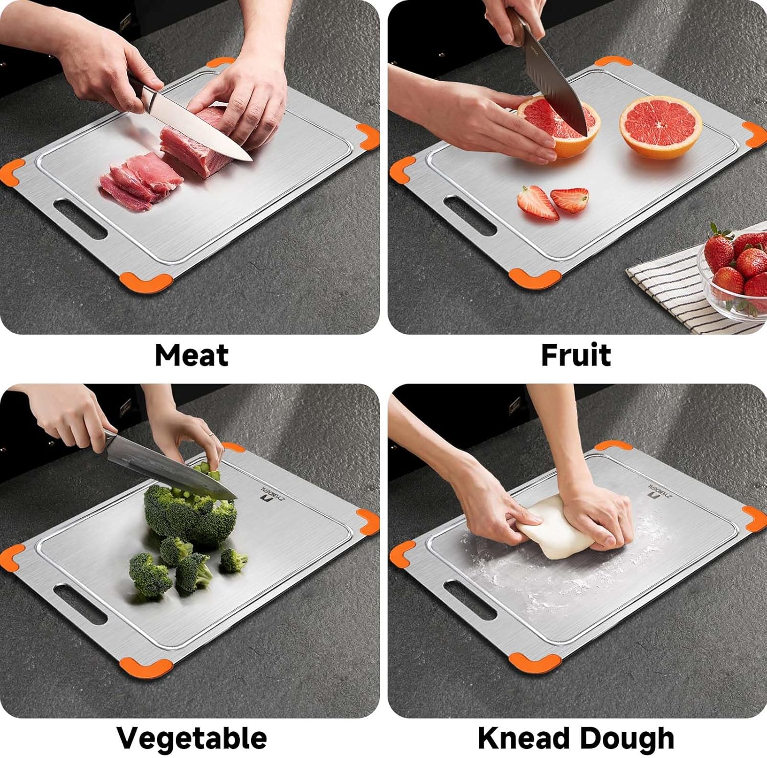 100% Pure Titanium Cutting Board with Grooves, Update Double Side Titanium Chopping Board, Silicone Anti-slip Stainless Cutting Boards for Kitchen 12 * 18 IN, Orange